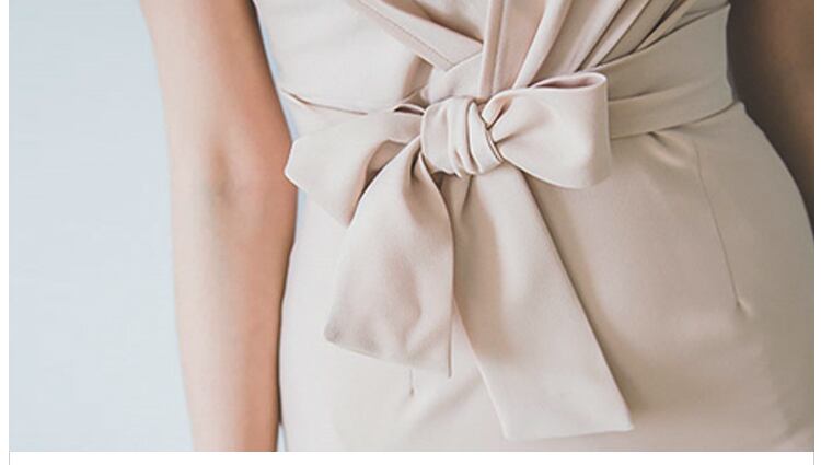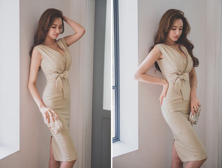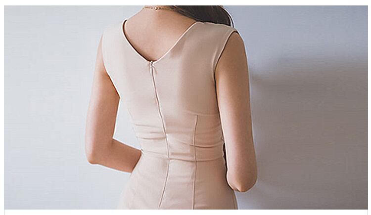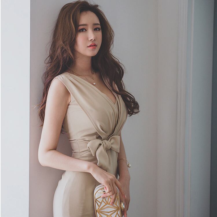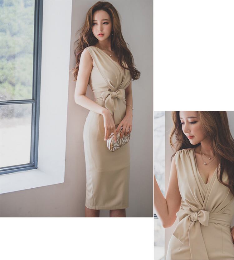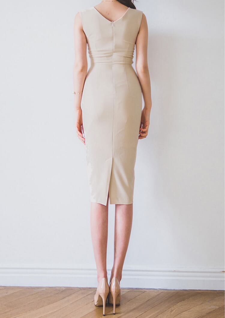 レディース ワンピース ドレス 膝丈 袖なし ノースリーブ Vネック タイト スリム 細身 フェミニン ボディコンシャス ウエストマーク ウエストリボン バックスリット ハイウエスト きれいめ シンプル 上品 おしゃれ エキゾチック クール エレガント モダン 抜け感 キュート 都会的 ラグジュアリー セクシー 色気 シック 無地 春 夏 パーティー 韓国 脚長 スタイルアップ S M L XL アプリコット