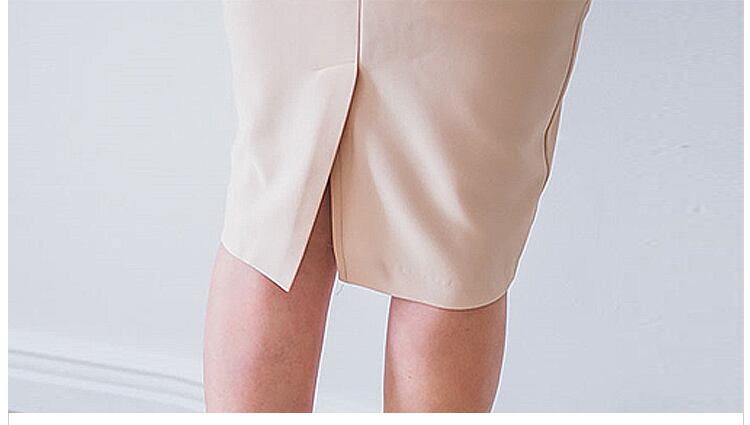 膝丈のタイトシルエットは、女性らしいラインを美しく強調し、Vネックデザインがデコルテを魅力的に演出します。
