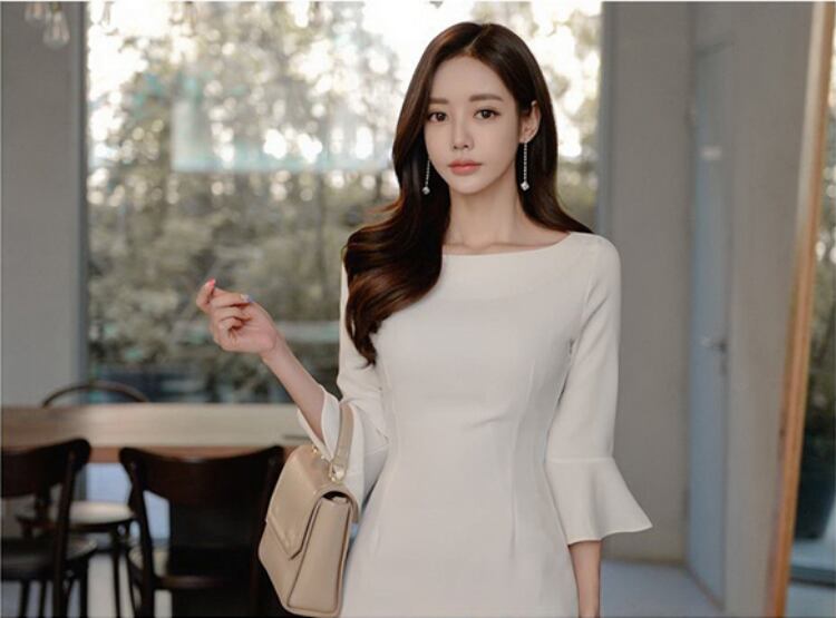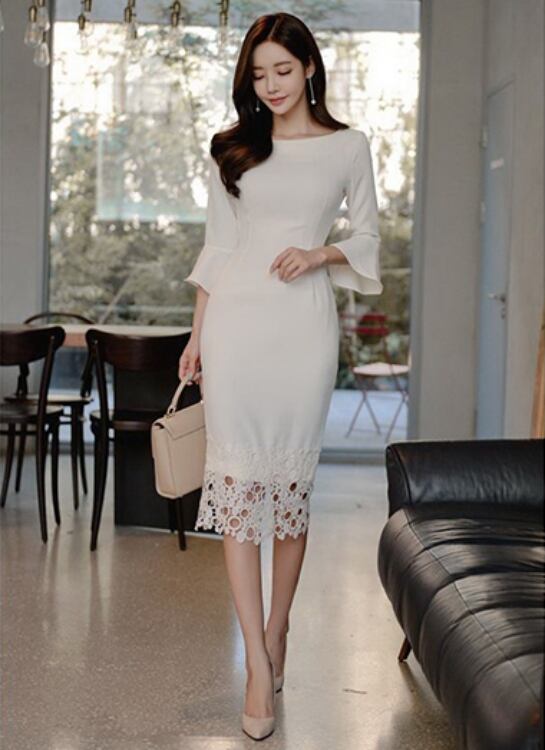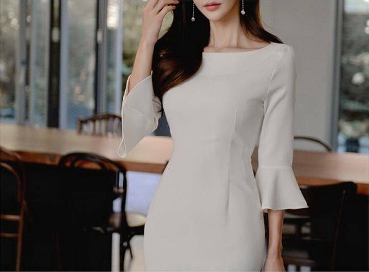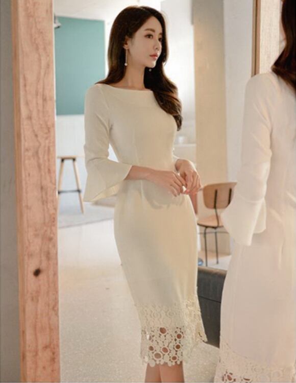 レディース ワンピース ドレス 膝丈 膝下 ミモレ 7分袖 フレアスリーブ ボートネック サブリナネック タイト スリム 細身 スマート フェミニン レース バックスリット コンサバ かわいい 大人可愛い きれいめ シンプル 上品 おしゃれ こなれ感 エレガント 抜け感 かっちり 都会的 ラグジュアリー ロマンティック セクシー シック 無地 春 夏 謝恩会 披露宴 デート パーティー レストラン 清楚 S M L XL 白 ホワイト