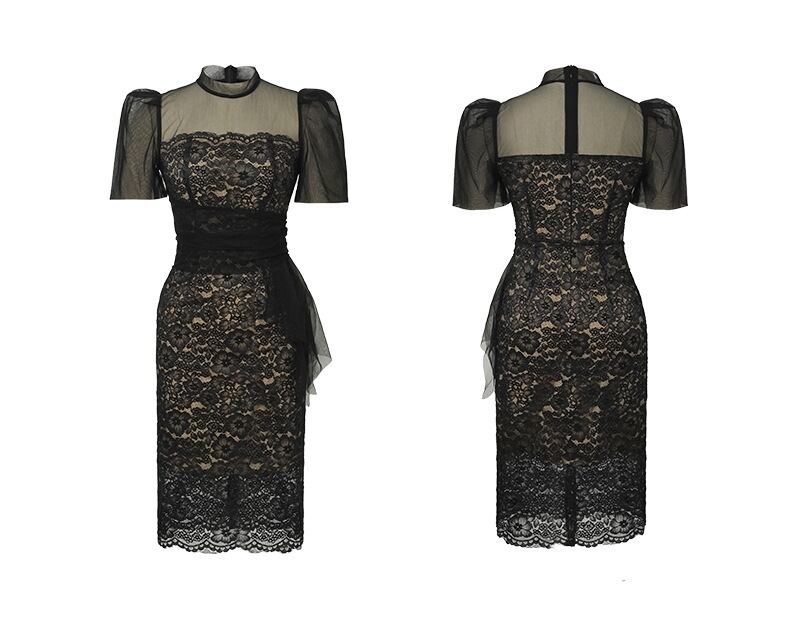レディース ワンピース ドレス 膝丈 半袖 ハイネック イリュージョンネック タイト スリム 細身 フェミニン ボディコンシャス レース チュール ウエストマーク ウエストリボン ファスナー ハイウエスト 透け感 シースルー 総レース かわいい 大人可愛い きれいめ 上品 おしゃれ エキゾチック クール エレガント ラブリー キュート 都会的 ラグジュアリー クラシカル ロマンティック シック 花柄 フラワー 総柄 春 夏 謝恩会 二次会 披露宴 パーティー ブラック パープル S M L XL 2XL
