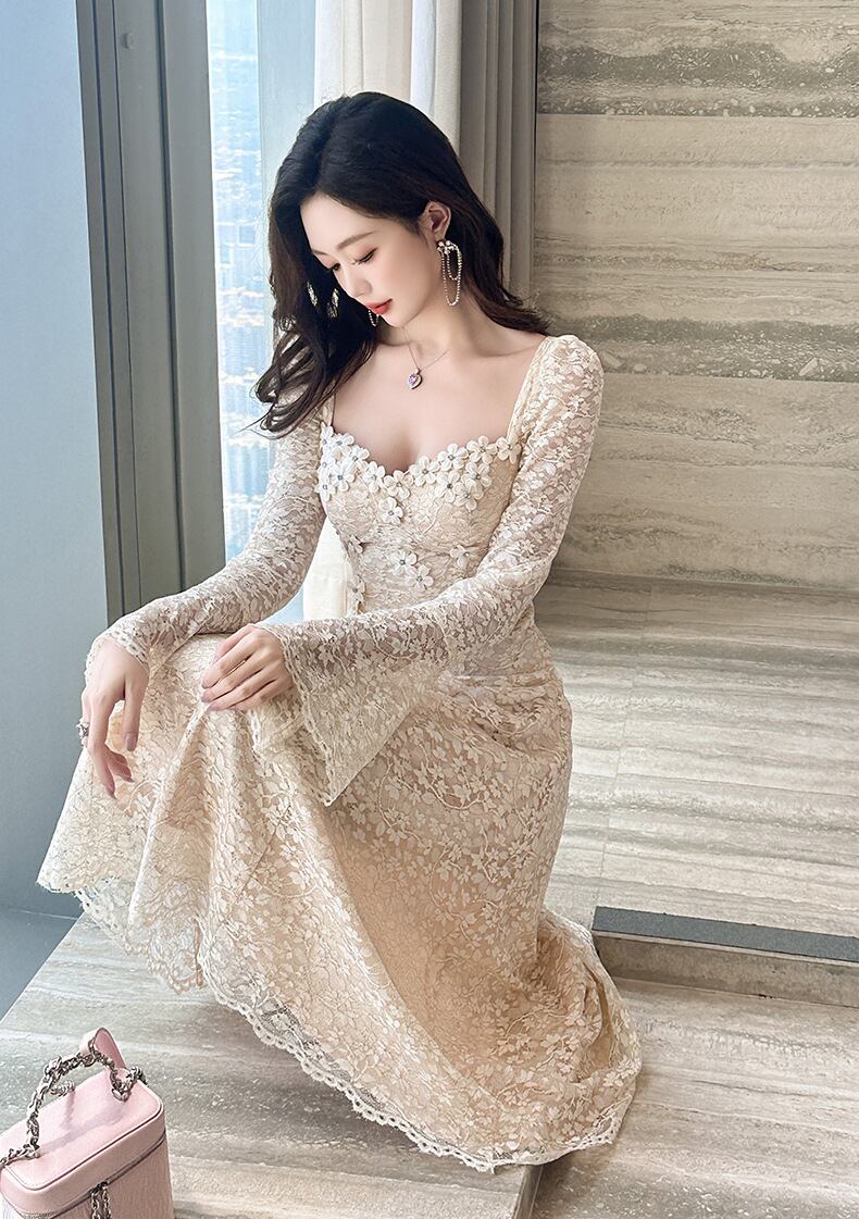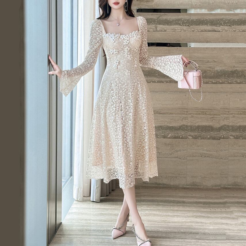 レディース ワンピース ドレス 膝丈 長袖 フレアスリーブ ベルスリーブ スクエアネック フレア Aライン フェミニン ハイウエスト 透け感 総レース かわいい きれいめ シンプル 上品 おしゃれ ガーリー エレガント ラブリー キュート ロリータ クラシカル ベーシック ロマンティック ナチュラル シック 花柄 フラワー 総柄 春 デート お出かけ パーティー ガーデン 美脚 脚長 モテ 清楚 スタイルアップ S M L XL 2XL アプリコット