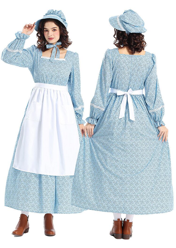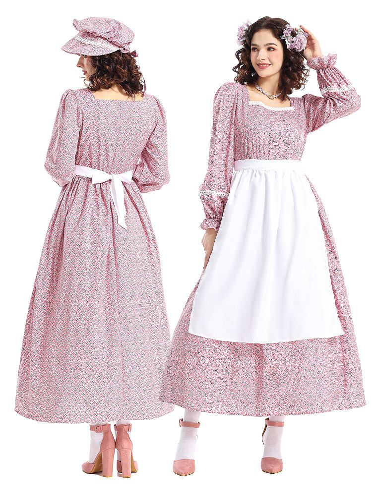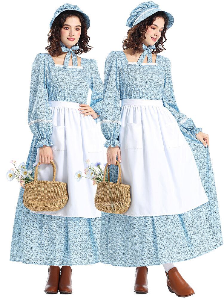 ナチュラルで上品なカントリースタイルのコスプレセットです。レトロで牧歌的な雰囲気漂うクラシカルなドレスと帽子、エプロンの3点セット。ペザントスリーブとスクエアネックが優雅さを引き立て、ハイウエストのマキシ丈ドレスがロマンティックな印象を演出します。