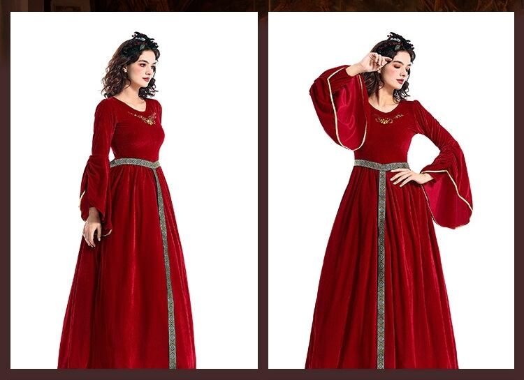 エレガントで主役級の存在感!異国のプリンセスのような特別な一着です。光沢のあるベロアとゴージャスなベルスリーブがエキゾチックな魅力を演出します。ブルーのドレスにはシルバーのフロントレット、レッドのドレスにはゴールドのフロントレット、グリーンのドレスには中東風のヘッドドレスが付属します。