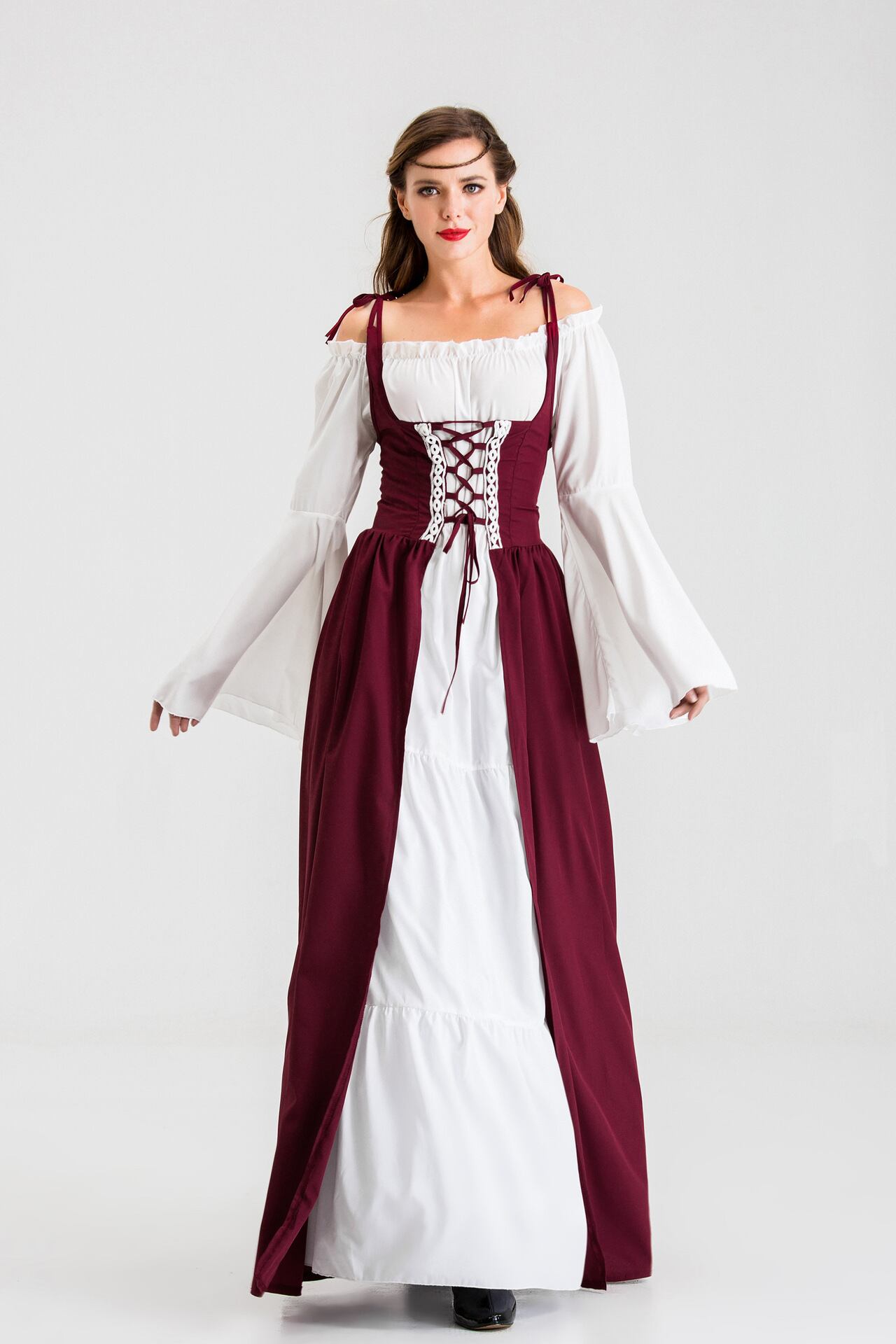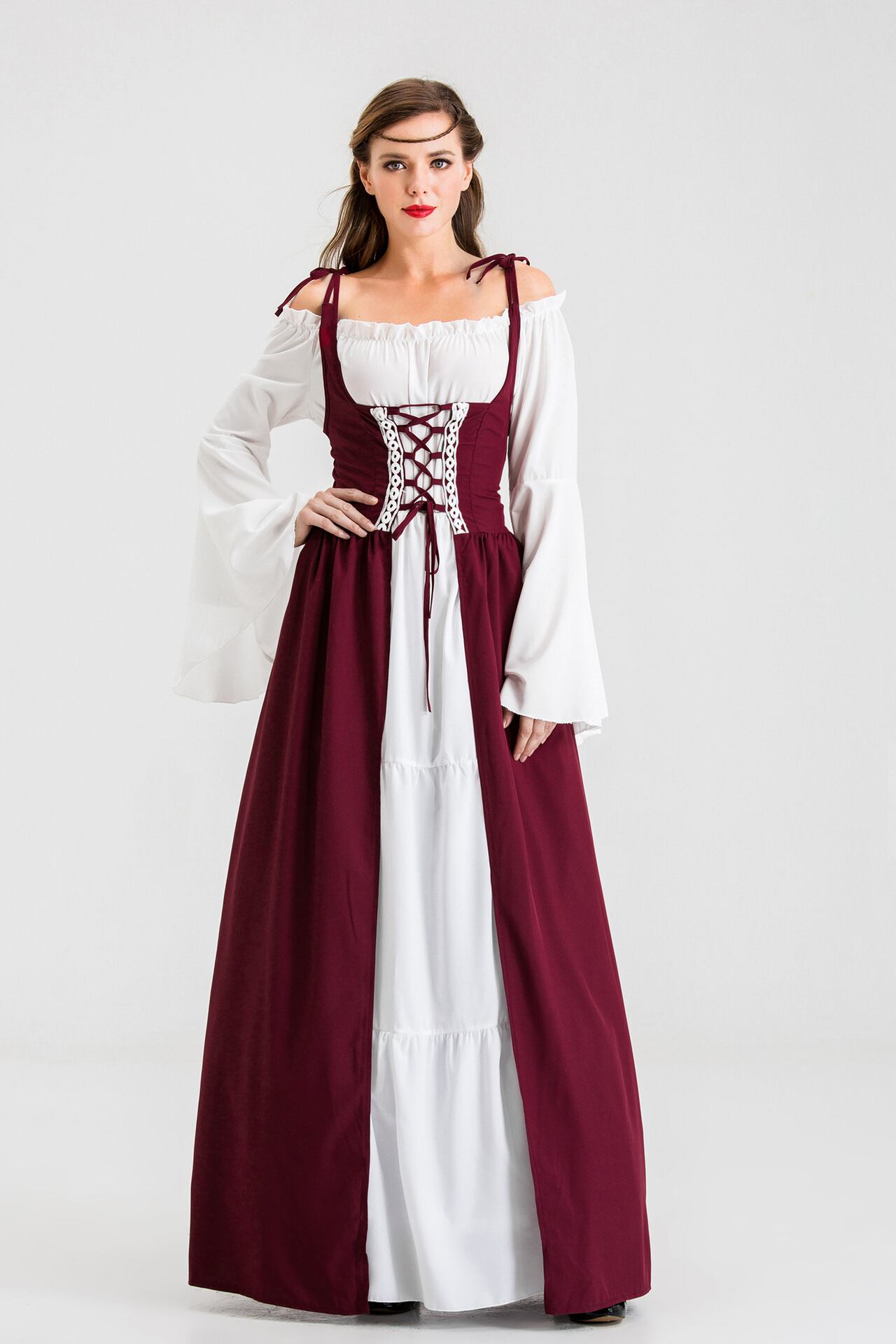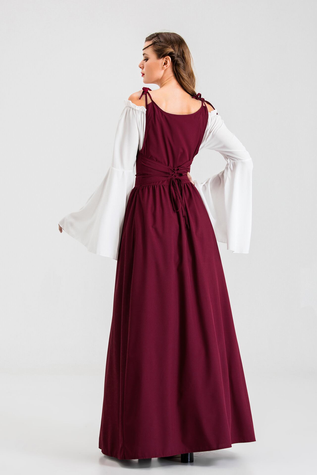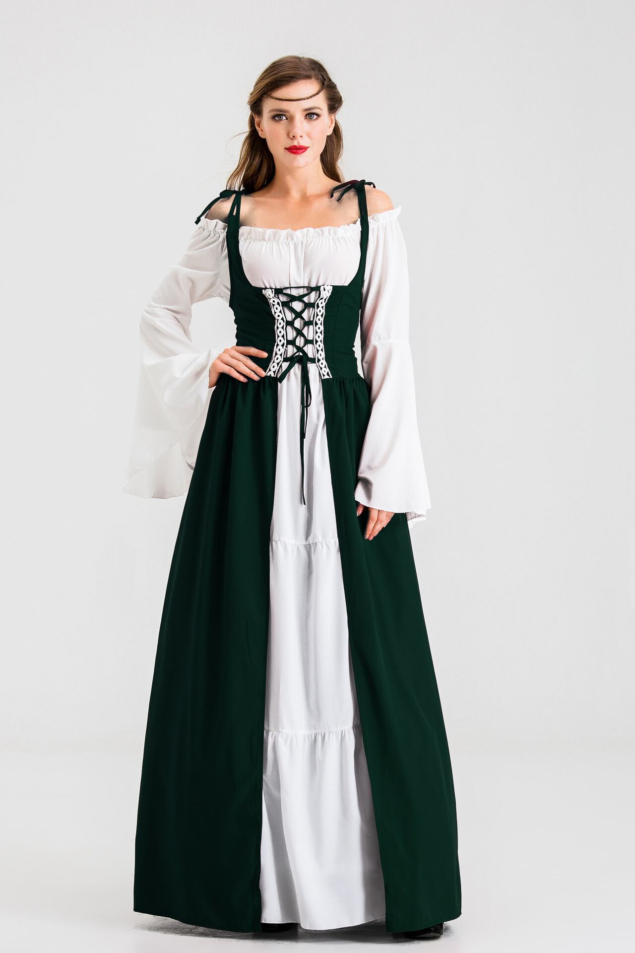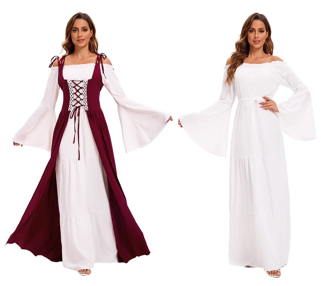 エレガントでロマンティックな中世ヨーロッパ風ドレスのご紹介です。優雅なベルスリーブとオフショルダーが特徴のマキシドレスです。レースアップとバイカラーデザインがエキゾチックで上品な印象を与えます。ブラック、ブルー、グリーン、ボルドーの4色からお選びいただけます。ハロウィンやイベントで存在感を放つクラシカルな一着です。