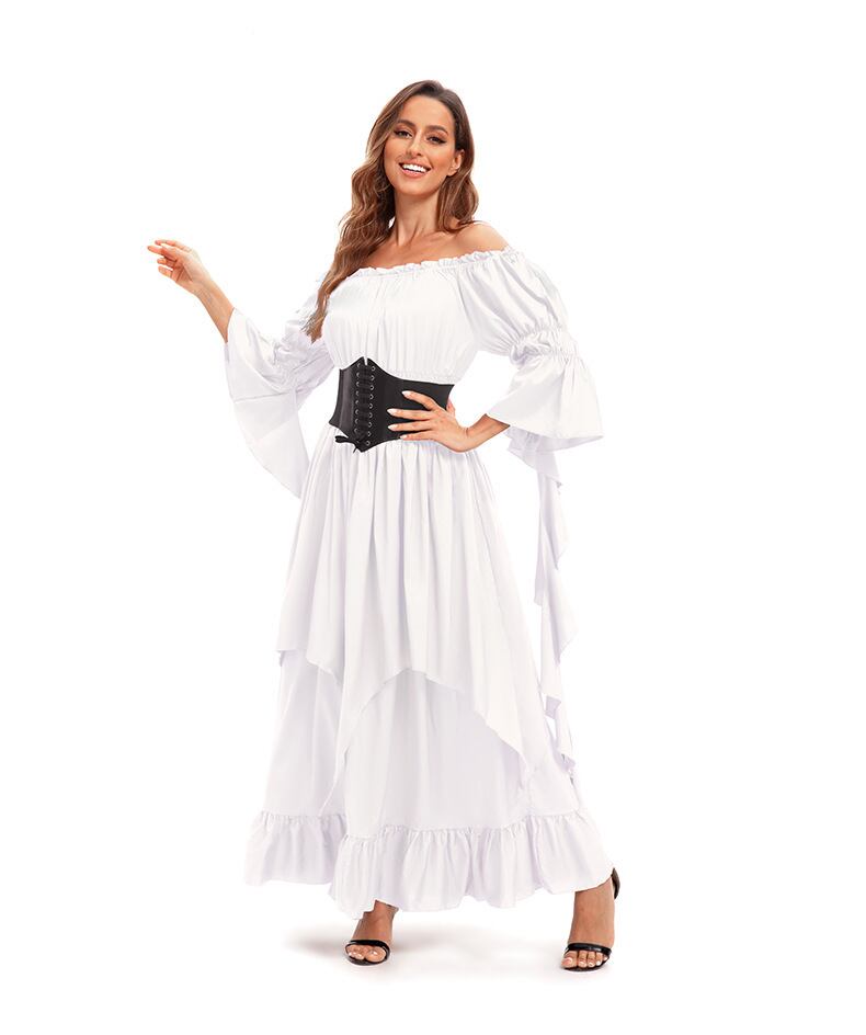 中世ヨーロッパを彷彿とさせる上品なペザントドレスのご紹介です。7分袖のベルスリーブとハイウエストデザインが特徴のこのドレスは、シンプルでありながら存在感のある一着。異国風の魅力が漂い、特別なイベントやハロウィンにぴったりです。ホワイト、ブラック、レッド、グリーン、ダークグリーンの5色からお選びいただけます。コルセットは付属しません。