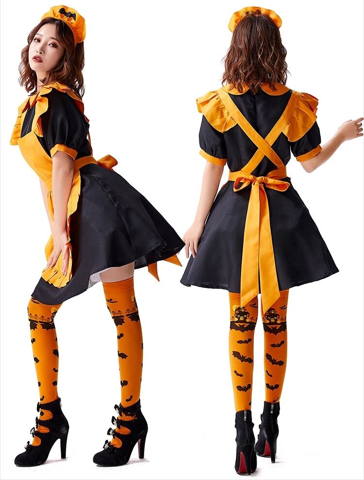 ハロウィンにぴったり!ジャックオランタンモチーフのメイド服のご紹介です。ブラックとオレンジのツートンカラーが特徴的な、ワンピースとエプロン、カチューシャの3点セット。エプロンにはフリルを施し、丸襟やフリルでロマンティックなガーリー感を演出。秋のイベントやパーティーで主役級の存在感を放つかわいい衣装です。