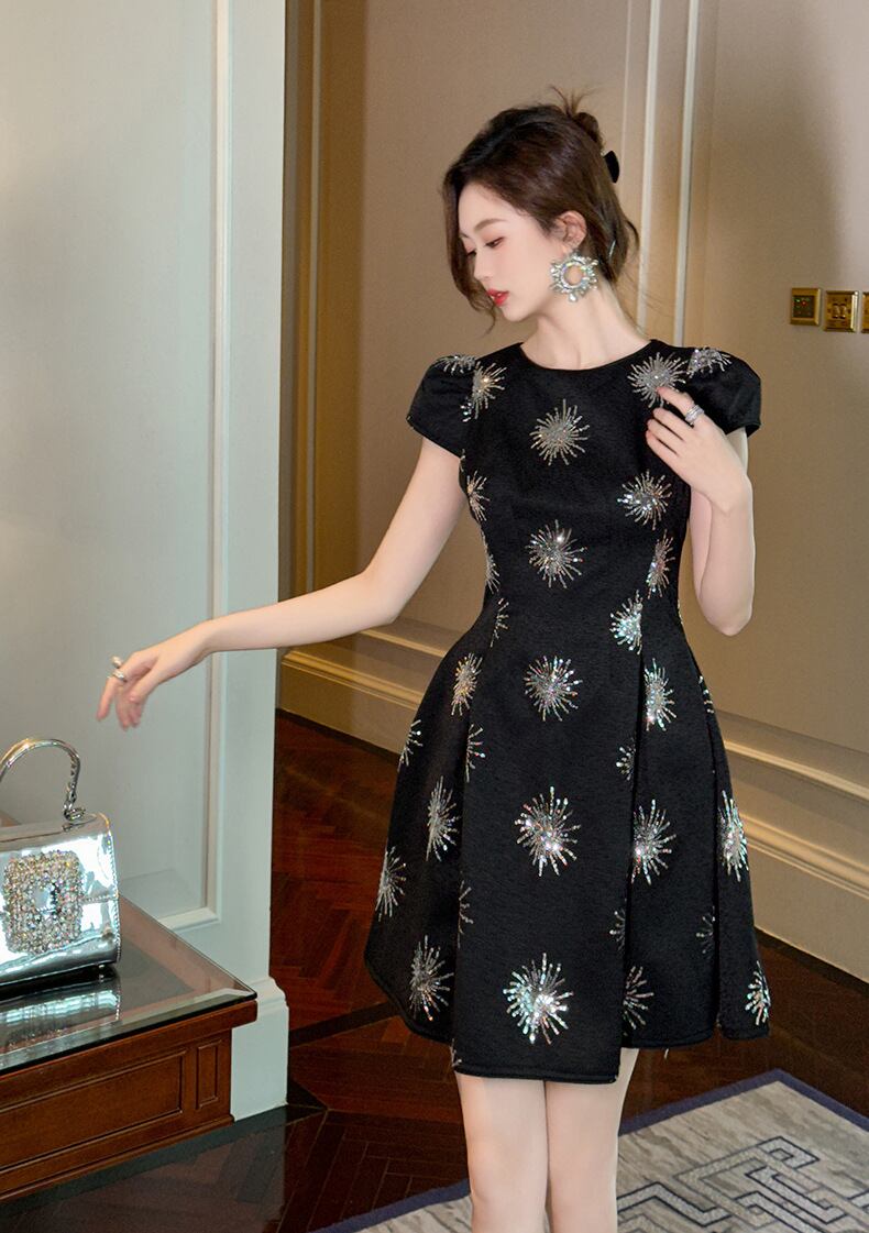 レディース スカート ワンピース ドレス フレア ミニ ショート 膝上 半袖 パフスリーブ ラメ感 ラウンドネック 襟なし セミフレア スリム Aライン タック タックプリーツ ファスナー ハイウエスト 薄手 かわいい 大人可愛い きれいめ 上品 おしゃれ こなれ感 クール 主役級 存在感 キュート ロマンティック セクシー 色気 春 夏 秋 冬 オールシーズン 二次会 発表会 デート パーティー イベント 美脚 脚長 モテ 清楚 スタイルアップ コスチューム 衣装 S M L 黒 ブラック 光