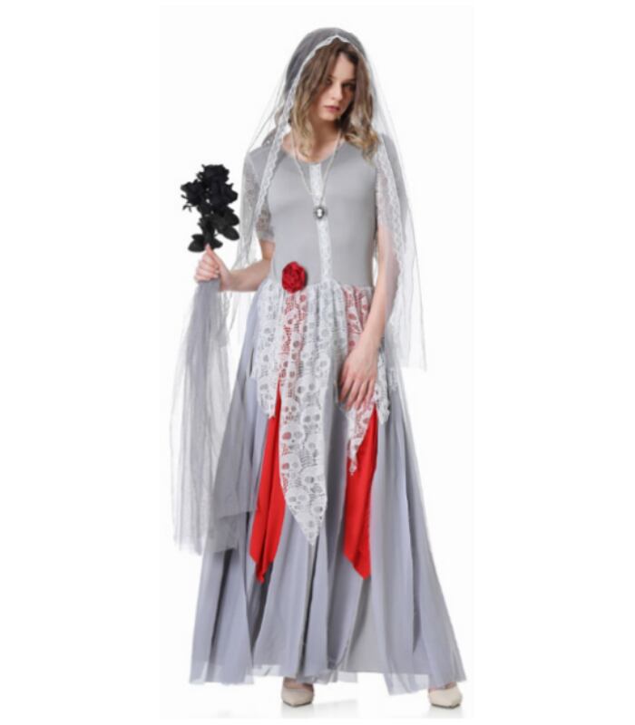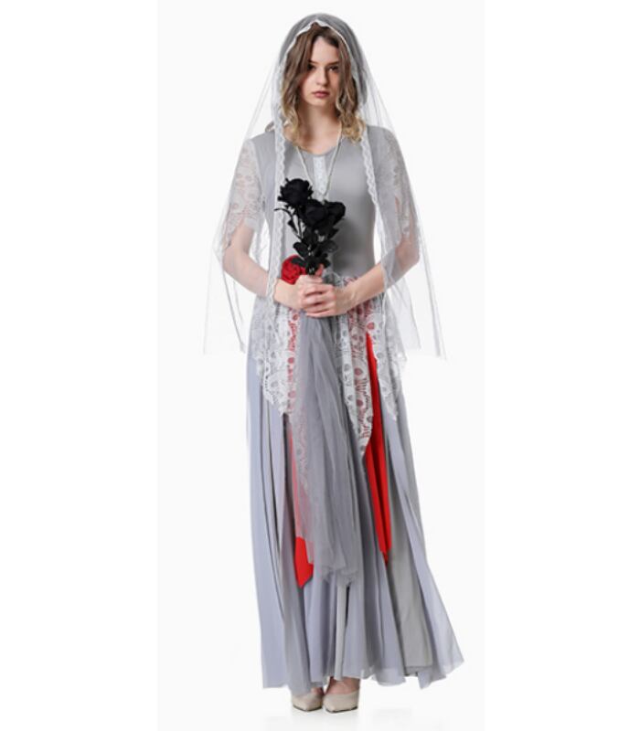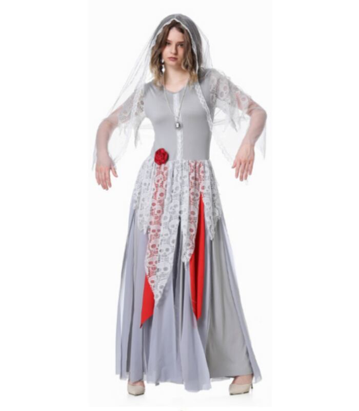幽霊花嫁の優雅さを纏うハロウィン衣装のご紹介です。透け感のあるシースルー素材が特徴的なロングドレスに、ベール、ネックレス、コサージュの4点セットが付属。ゴーストブライドのコスチュームセットとして、大人可愛いグレーのフレアデザインが異国風の上品さを引き立てます。ハロウィンパーティーでひときわ目立つこと間違いなし。