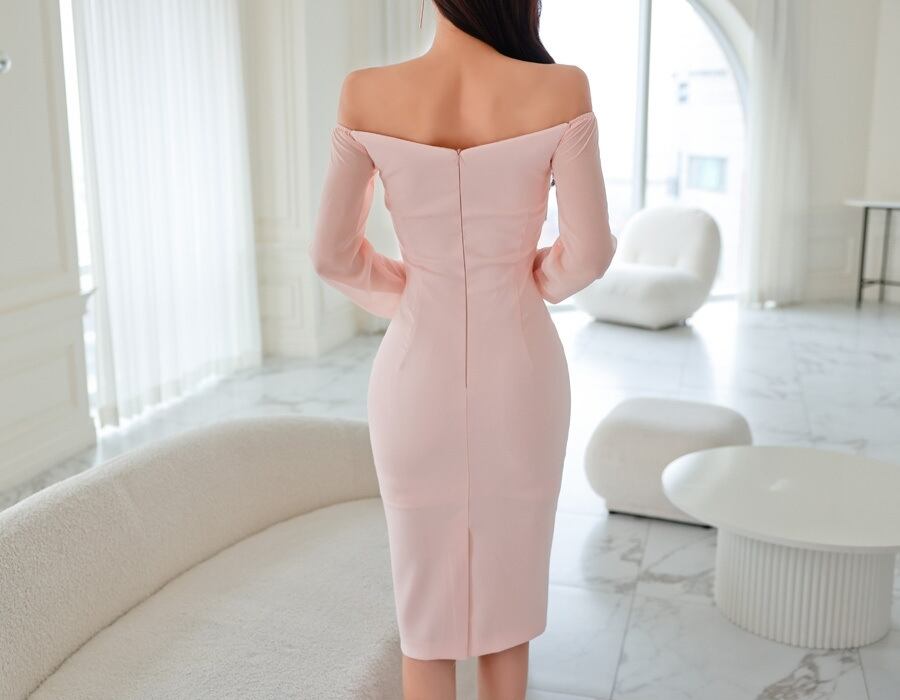 レディース ワンピース ドレス 膝丈 長袖 オフショルダー タイト スリム 細身 フェミニン ボディコンシャス スレンダー リボン バックスリット ファスナー 透け感 薄手 かわいい 大人可愛い きれいめ シンプル カジュアル 上品 ガーリー エレガント ラブリー キュート 都会的 ロマンティック セクシー 色気 シック 無地 春 夏 秋 ロングシーズン お出かけ パーティー レストラン ホテル キャバ ラウンジ モテ 肌見せ 涼しい S M L XL ピンク