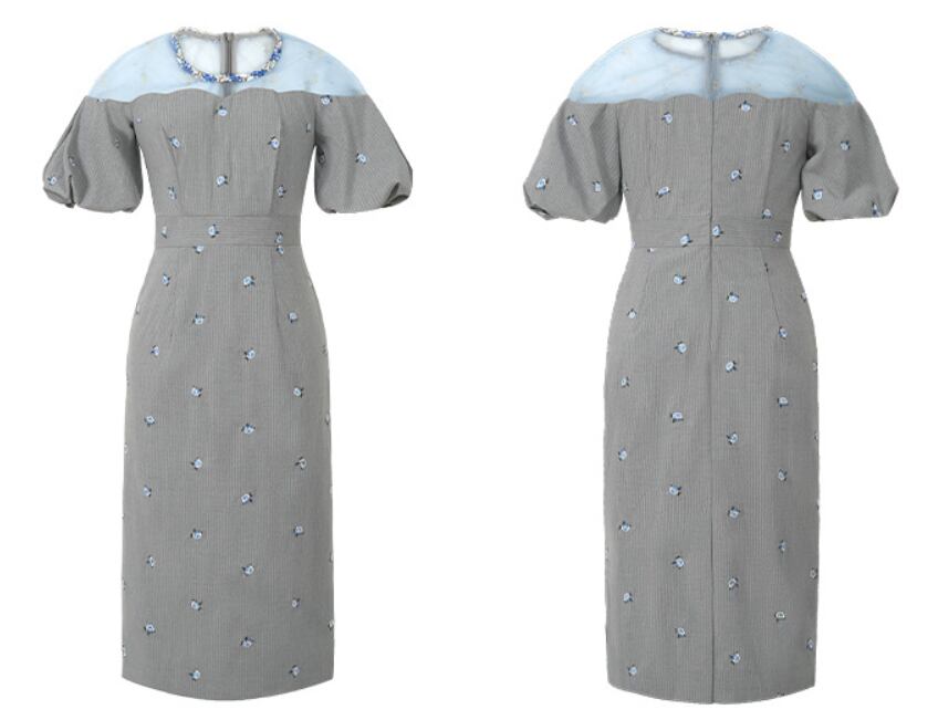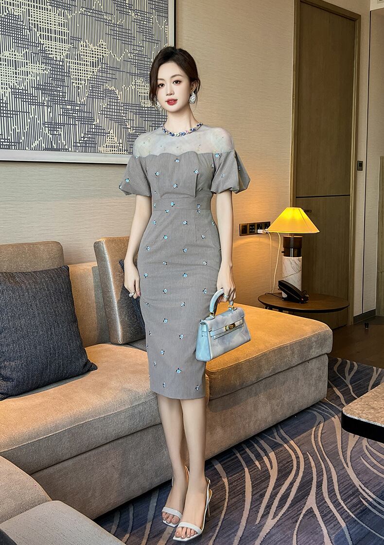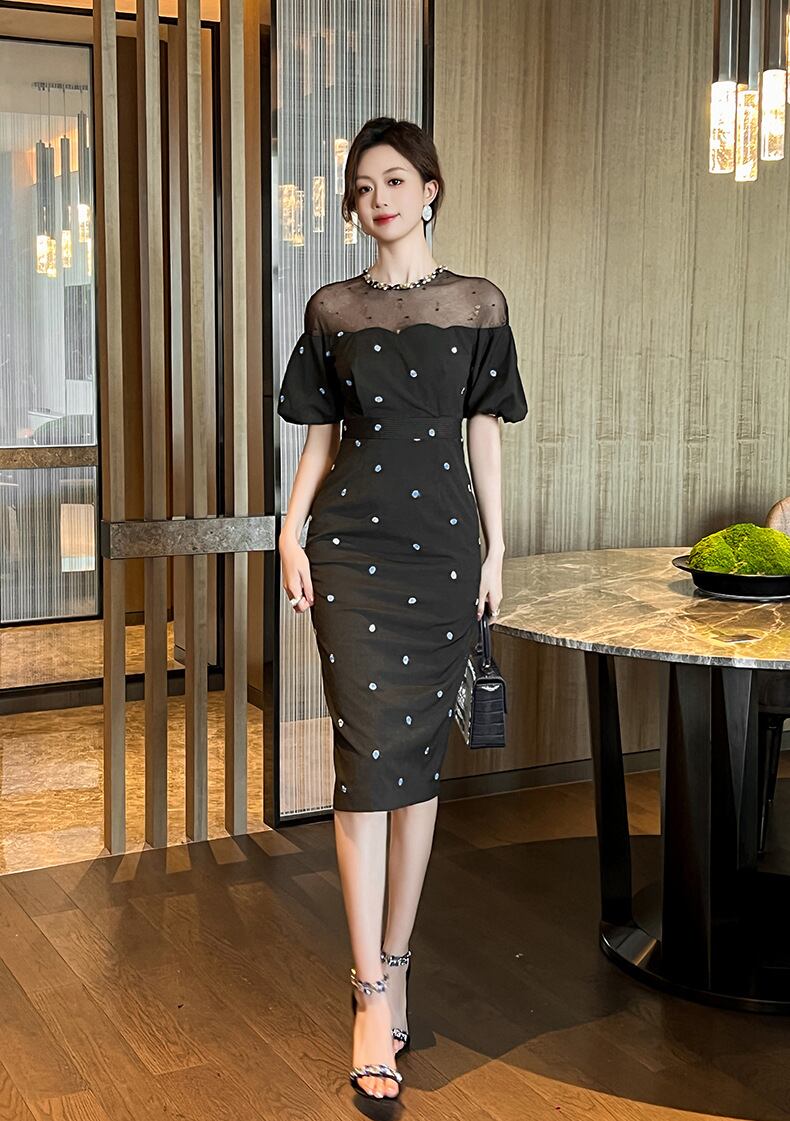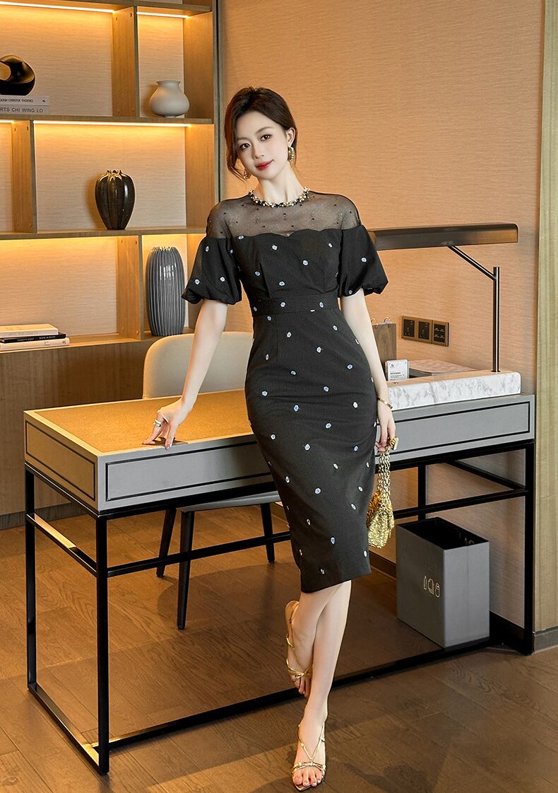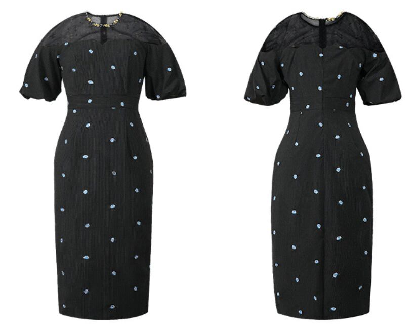 レディース スカート ドレス タイトスカート 膝下 ミモレ 半袖 ボリューム袖 パフスリーブ ラウンドネック タイト スリム 細身 刺繍 ファスナー ハイウエスト 透け感 シースルー きれいめ シンプル 上品 おしゃれ クール エレガント 主役級 存在感 セクシー 色気 無地 花柄 春 夏 秋 冬 オールシーズン ロングシーズン 発表会 デート パーティー イベント コンサート コーデ 美脚 モテ 清楚 スタイルアップ 肌見せ S M L 黒 ブラック グレー ライトグレー ベーシックカラー 大人カラー