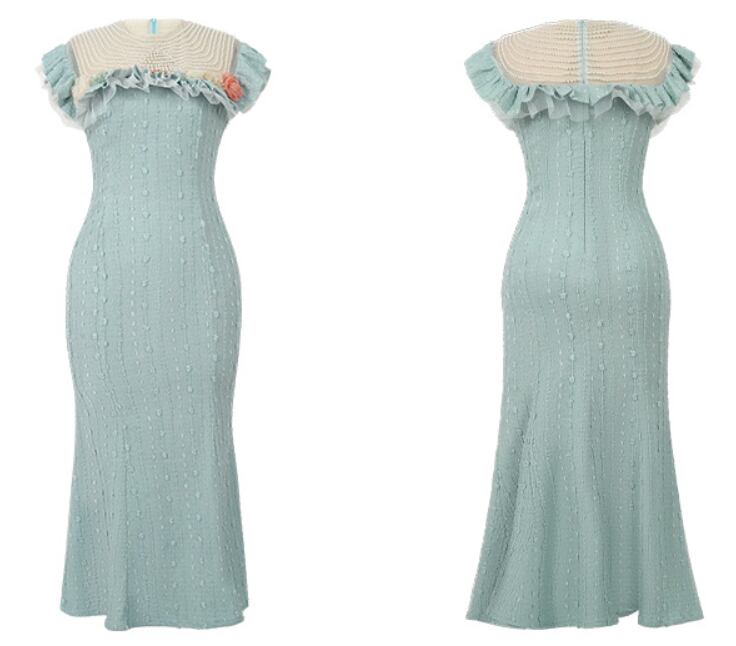 このドレスは、大人の女性にぴったりなエレガントで魅力的な一枚です!ノースリーブのラウンドネックとハイウエストデザインが、スタイルアップ効果を生み出し、ウエストラインをすっきりと見せます。セミフレアのシルエットとフリルが、女性らしさを引き立て、特別なデートやパーティーにも最適です。さらに、透け感のあるシースルーデザインが、ほんのり色気を添えるポイントです。
