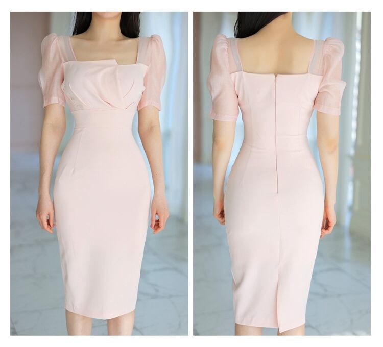 レディース ワンピース ドレス 膝丈 ミディ 半袖 パフスリーブ パワーショルダー スクエアネック アシンメトリーネック タイト スリム 細身 フォーマル フェミニン ボディコンシャス タック バックスリット 透け感 薄手 かわいい 大人可愛い きれいめ シンプル 上品 おしゃれ エレガント キュート 都会的 セクシー 色気 シック 無地 春 夏 謝恩会 結婚式 二次会 披露宴 パーティー レストラン ホテル S M L XL ホワイト ピンク