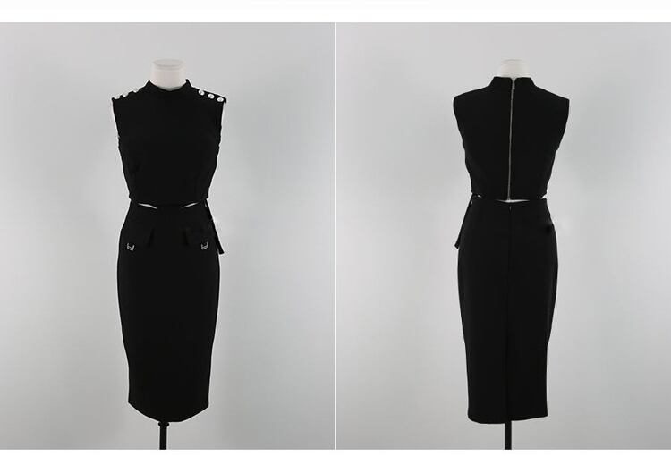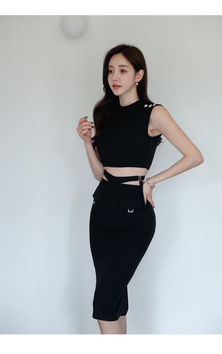 レディース スカート トップス セットアップ タイトスカート ペンシルスカート 膝丈 クロップド丈 袖なし ノースリーブ ハイネック モックネック ボトルネック タイト スリム 細身 スマート ボディコンシャス ウエストマーク バックスリット ハイウエスト シンプル 上品 おしゃれ かっこいい エキゾチック 個性的 クール モード系 エレガント モダン 都会的 セクシー 色気 シック 無地 春 夏 普段使い スタイルアップ S M L XL ブラック