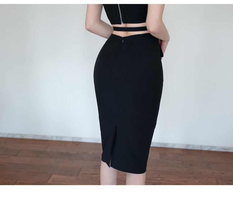 セクシーでモードな魅力を纏うセットアップのご紹介です。タイトなクロップド丈のトップスとペンシルスカートが絶妙に組み合わさり、シンプルながらも上品で、かっこよさを引き立てる一着です。ハイウエストデザインにより、スタイルアップ効果が実現でき、都会的でエレガントな印象を与えます。