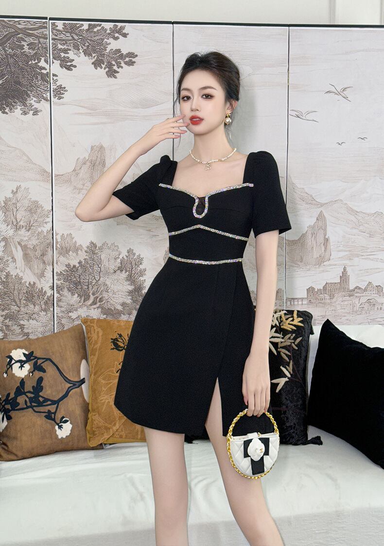 シンプルでありながら華やかさを持つ、ミニドレスのご紹介です。無地のワントーンに煌びやかなラインが施された、Aラインのドレスは、リッチな質感を楽しめる一着です。ハイウエストデザインがスタイルを引き立て、女性らしいシルエットを演出します。スカートのスリットからさりげなく肌を見せることで、セクシーでありながらも上品な印象を与えています。