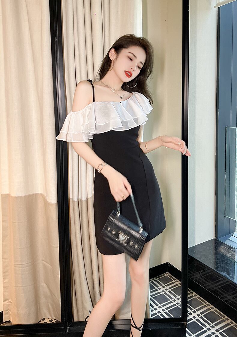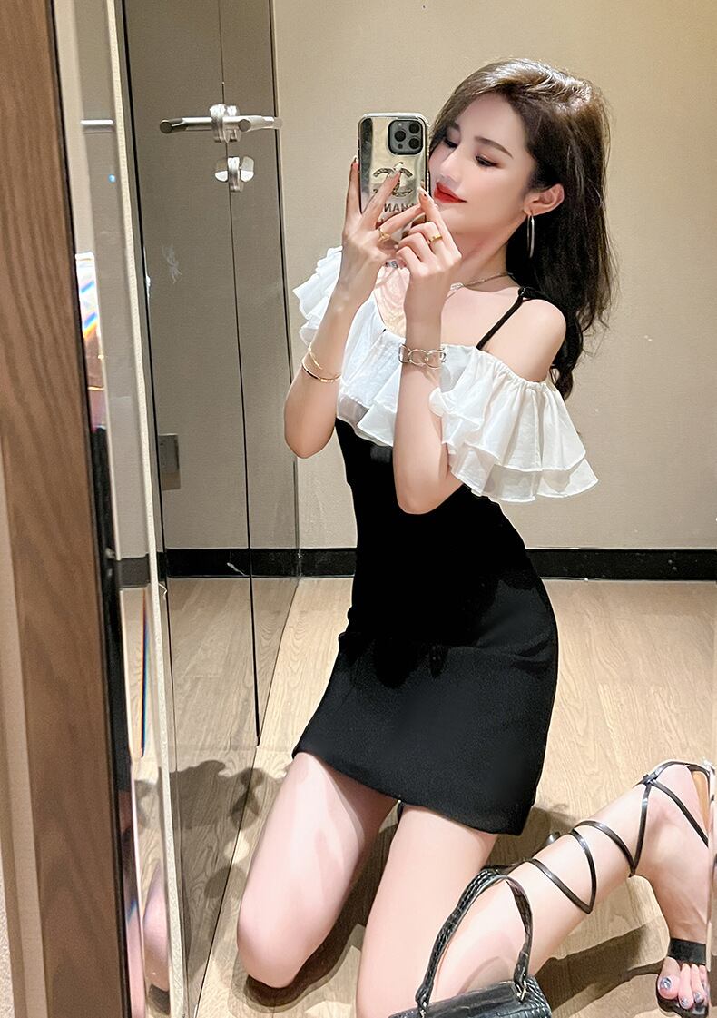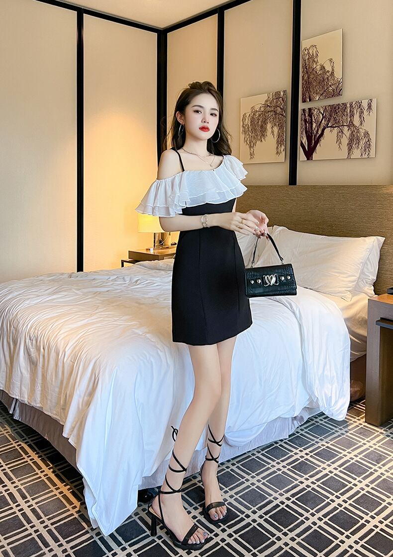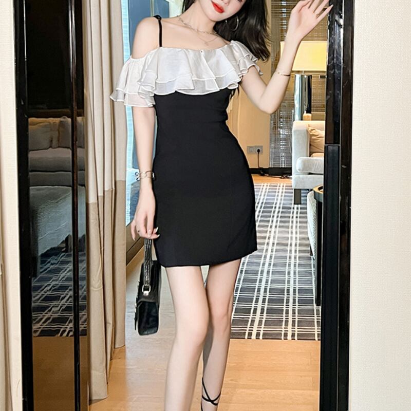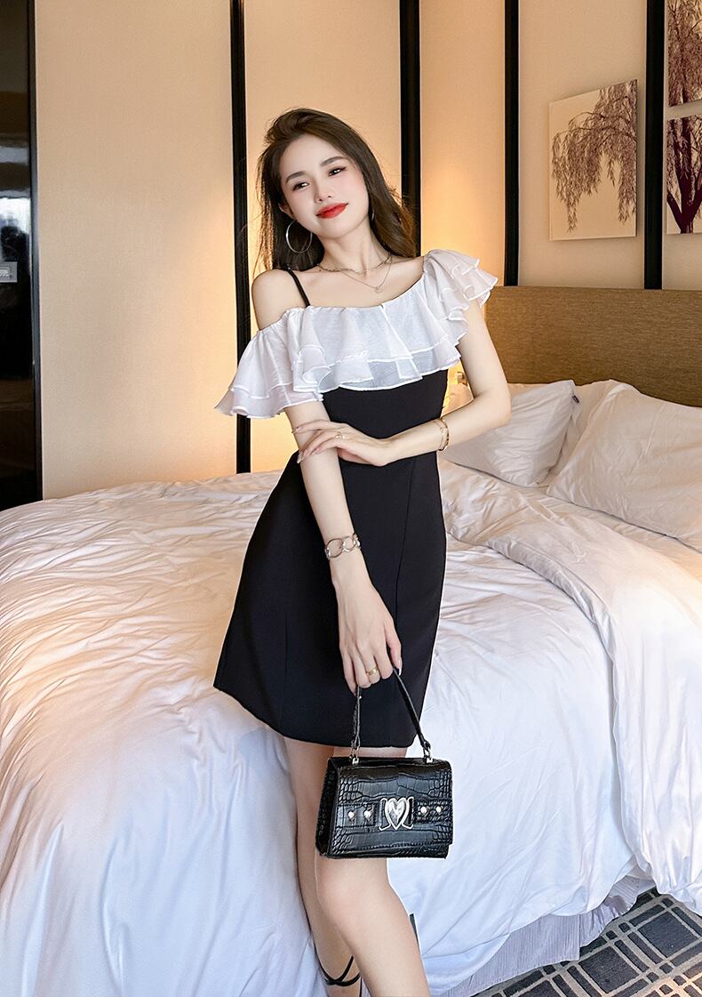 シンプルでありながら、魅力的なスタイルを演出するワンピースのご紹介です。オフショルダーのネックラインにあしらわれた透け感のあるティアードフリルが、可愛らしさとエレガントさを兼ね備えた一着です。Aラインのシルエットが女性らしさを引き立てます。