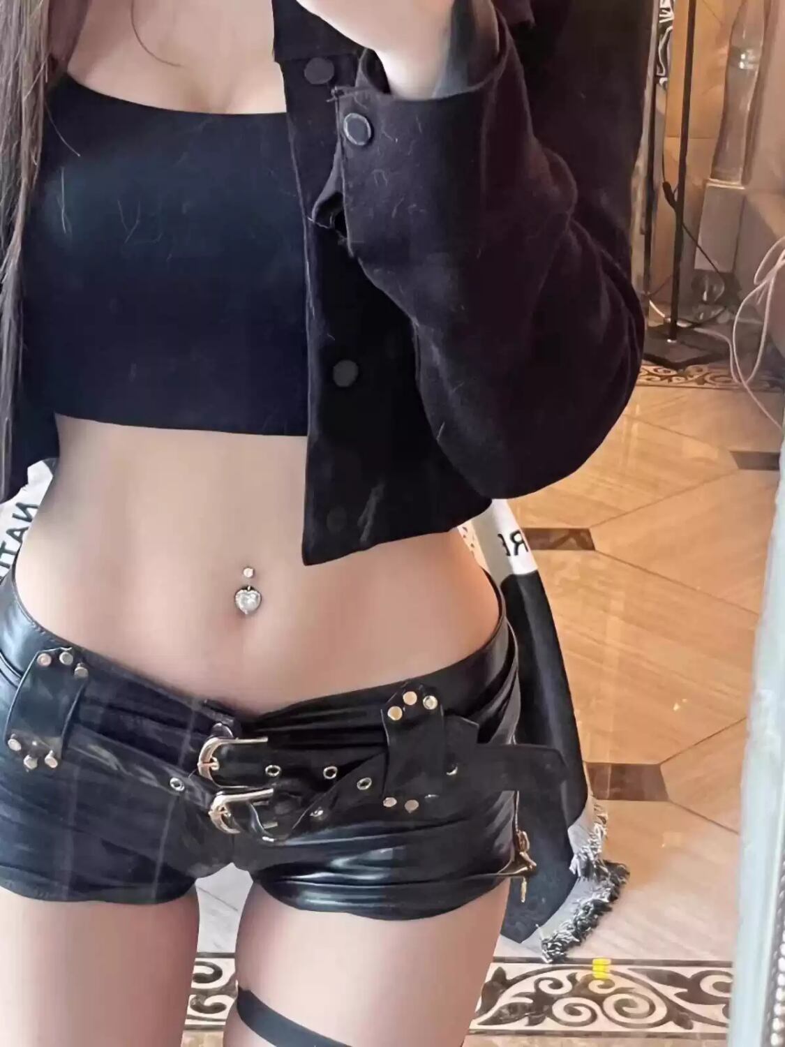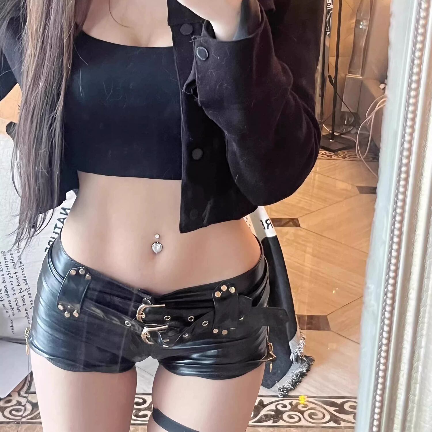 レディース パンツ ボトムス ホットパンツ レザーパンツ ミニ ショート タイト 細身 スキニー ベルト ファスナー 異国風 ローライズ ローウエスト フェイクレザー おしゃれ かっこいい エキゾチック 個性的 クール モード系 存在感 ゴシック 都会的 アメリカン アクティブ ワイルド セクシー 色気 ゴス メタル パンク ロック 辛口 無地 春 夏 ライブ 普段使い コスチューム 衣装 S M L XL 黒 ブラック 光沢