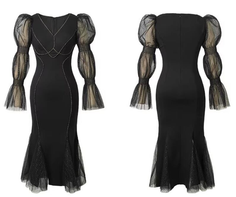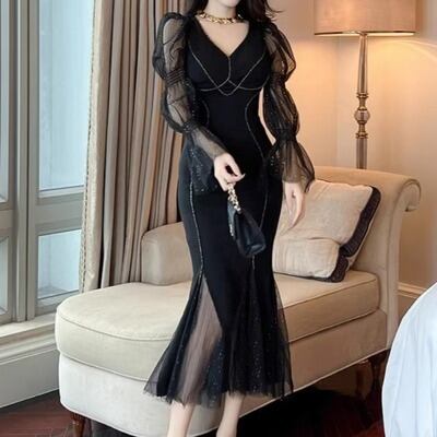 レディース スカート ドレス ロングスカート 膝下 ロング 長袖 バルーン袖 Vネック セミフレア タイト スリム 細身 Aライン レース チュール ファスナー 透け感 シースルー 大人可愛い 上品 おしゃれ かっこいい 個性的 エレガント 主役級 存在感 セクシー 色気 無地 春 夏 秋 冬 オールシーズン ロングシーズン デート パーティー イベント 発表会 コンサート モテ 清楚 スタイルアップ コスチューム 衣装 S M L XL 2XL 大きいサイズ 黒 ブラック ベーシックカラー 大人カラー