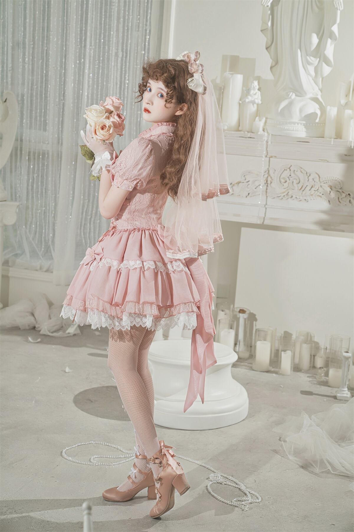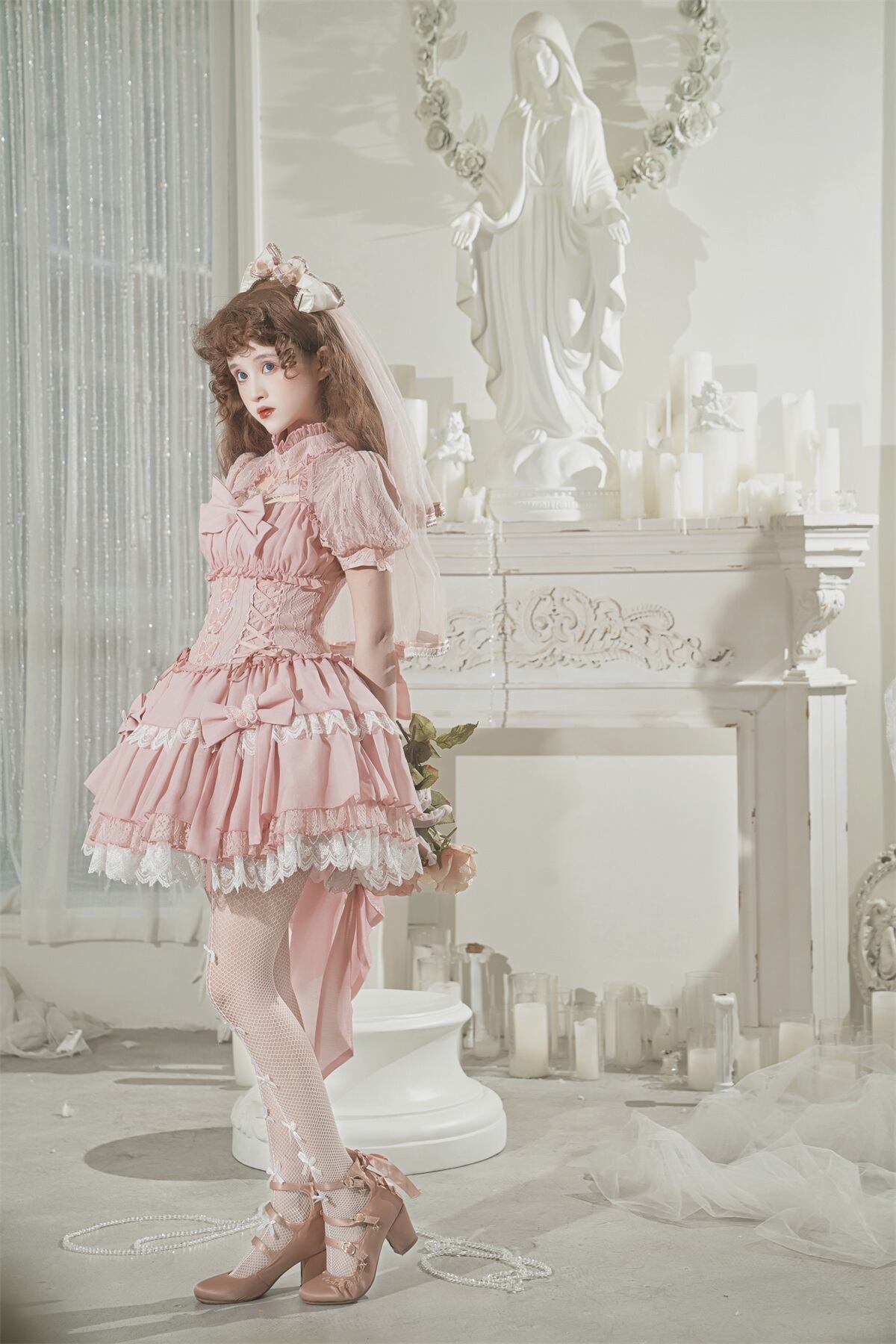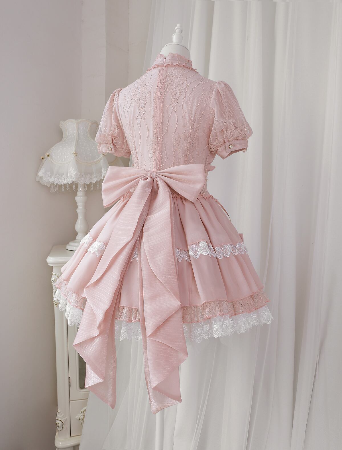 レースやフリル、リボンや蝶などの装飾がロマンティックなムードを高める、ロリータスタイルのワンピース。チョーカーネックがフェミニンさを際立たせ、パフスリーブとギャザーが優美なシルエットを完成させます。ピンクの華やかな色合いが可愛らしさを引き立て、どの角度から見ても美しく映えるデザインです。