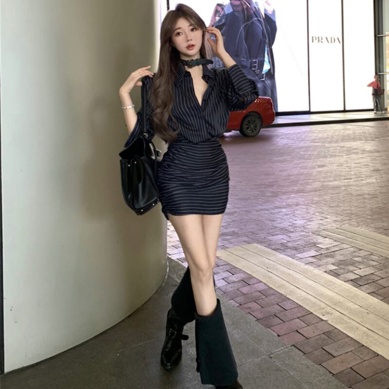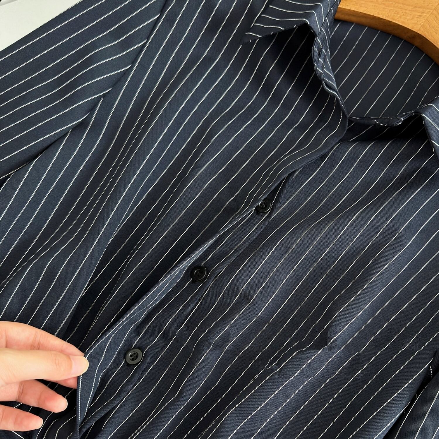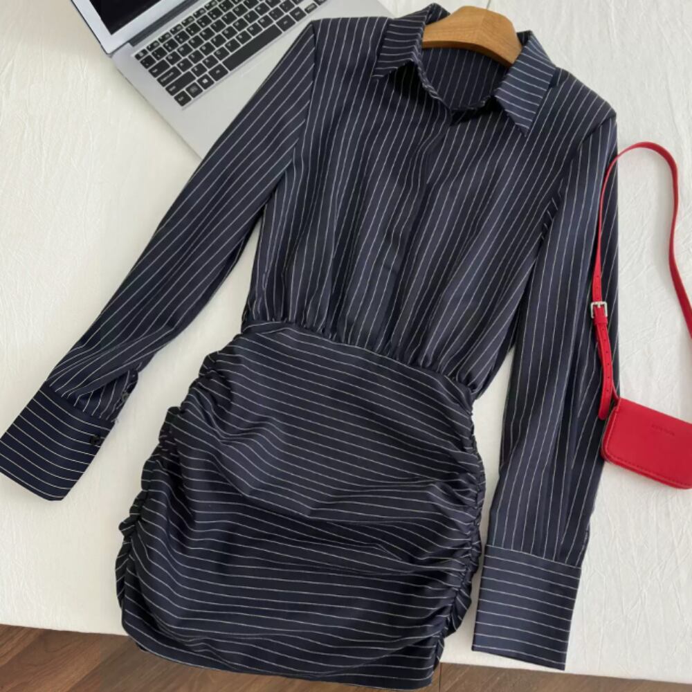 レディース ワンピース シャツワンピ ミニ 長袖 襟付き 角襟 ステンカラー スタンダードカラー レギュラーカラー タイト Xライン アワーグラスライン ハイウエスト 前開き コンサバ ボタン ギャザー ドッキング 比翼仕立て 肩パッド付き かわいい きれいめ シンプル カジュアル 上品 おしゃれ こなれ感 クール エレガント モダン 都会的 ラグジュアリー シック ノーブル ボーダー ストライプ 春 秋 デート お出かけ 普段使い スタイルアップ XS S M L ネイビー