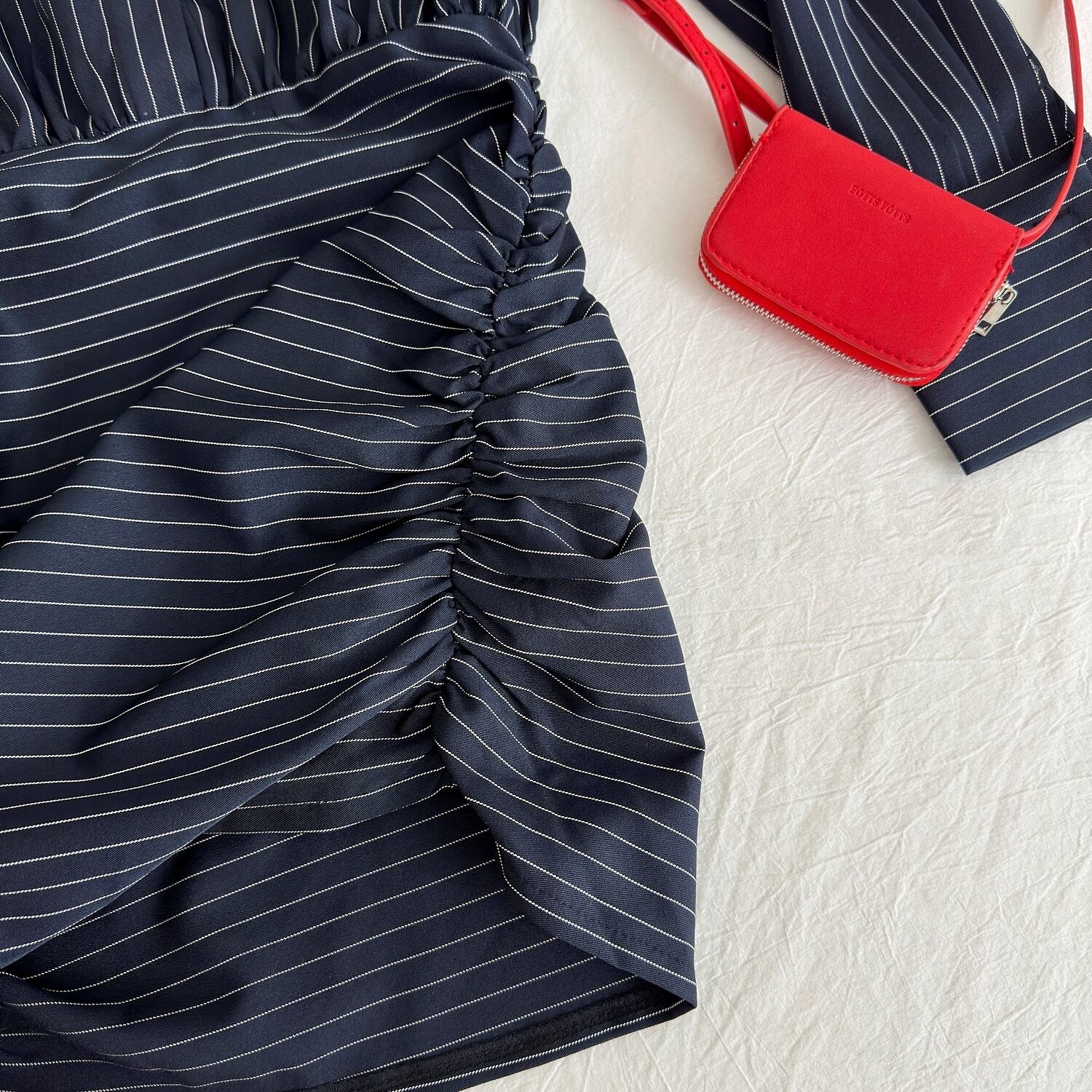 比翼仕立てのストライプトップとミニ丈のボーダースカートがドッキングしたシャツワンピです。シンプルながら個性的なデザインが際立ち、クールでおしゃれな印象を与えます。ギャザーが施されたハイウエスト仕様がスタイルアップを叶え、着脱可能な肩パッド付きでメリハリのあるシルエットに。ネイビーカラーのノーブルな雰囲気で、コンサバながらも華やかな装いに。