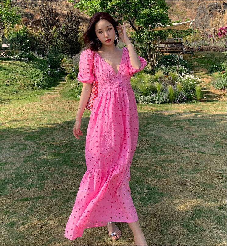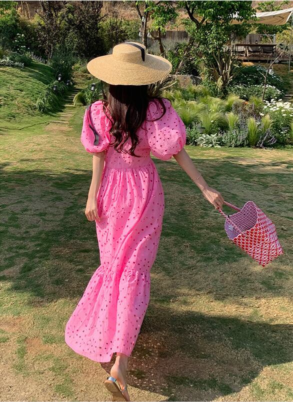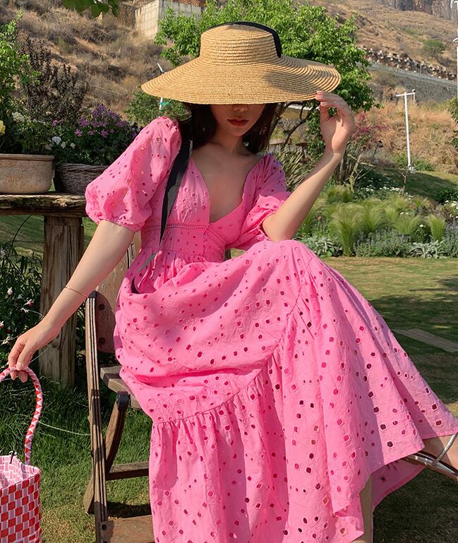 レディース スカート ワンピース フレアスカート ロングスカート 膝下 ロング アンクル丈 半袖 パフスリーブ Vネック 襟なし フレア セミフレア Aライン シフォン ハイウエスト かわいい 大人可愛い きれいめ シンプル カジュアル おしゃれ ラフ 主役級 キュート ナチュラル セクシー 色気 爽やか 春 夏 デート お出かけ お泊まり イベント リゾート 旅行 海 プール ビーチ 休日 バカンス コーデ 楽ちん 体型カバー モテ 清楚 スタイルアップ 肌見せ 涼しい 通気性 S M L XL ピンク