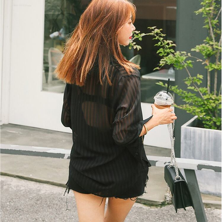 レディース トップス シャツ ブラウス 長袖 襟付き 角襟 スタンダードカラー レギュラーカラー シフォン 前開き 透け感 シースルー ボタン シアー かわいい 大人可愛い シンプル カジュアル 上品 おしゃれ かっこいい こなれ感 個性的 クール エレガント モダン 抜け感 都会的 ラグジュアリー セクシー 色気 シック 爽やか ストライプ 春 夏 秋 デート お出かけ 楽ちん 普段使い 肌見せ S M L XL ゆったり ゆる 黒 ブラック