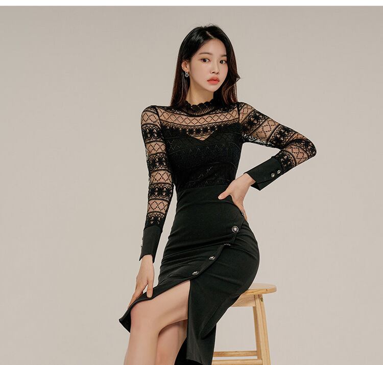 洗練された大人可愛いシースドレスをご紹介します!透け感のあるレースが繊細でフェミニンな雰囲気を演出し、絞られたハイウエストが美しいアワーグラスラインを強調します。長袖のハイネックスタイルがエレガントさを保ちながら、切り替えデザインやスリットが個性的でどんなシーンでも目を引く一着です。