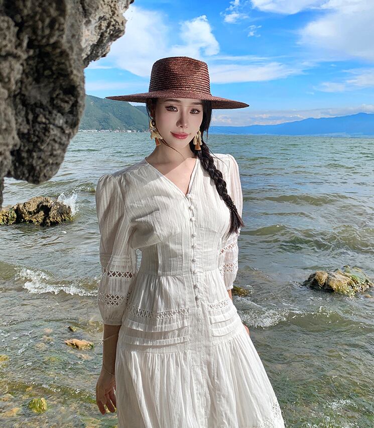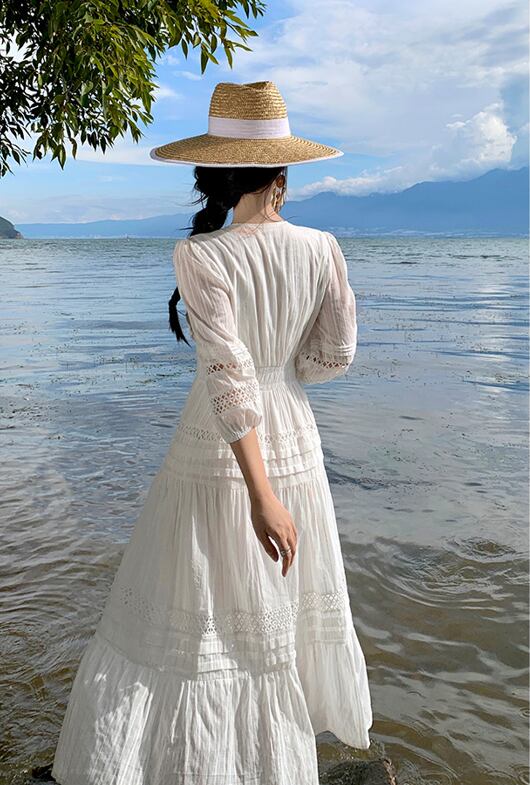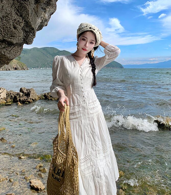 レディース スカート ワンピース フレアスカート ロングスカート 膝下 ロング 丈長 ミディ 7分袖 パフスリーブ Vネック 襟なし フレア セミフレア スリム Aライン ウエストマーク ハイウエスト 透け感 薄手 かわいい 大人可愛い きれいめ シンプル カジュアル 上品 おしゃれ こなれ感 キュート ナチュラル 色気 爽やか 無地 春 夏 秋 デート お出かけ イベント リゾート 旅行 海 ビーチ 休日 バカンス 楽ちん モテ 清楚 スタイルアップ 涼しい S M L XL 白 ホワイト モノトーン
