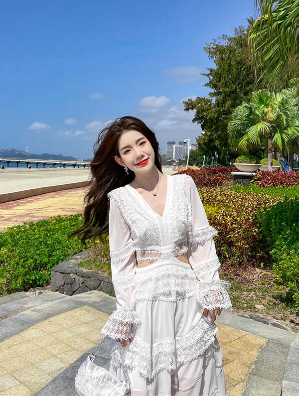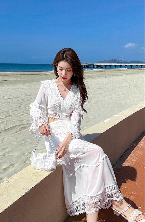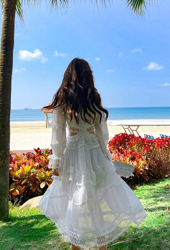 レディース スカート ワンピース ドレス フレアスカート ロングスカート 膝下 ロング ミディ 長袖 萌袖 フリル袖 Vネック 襟なし フレア セミフレア Aライン レース ハイウエスト 透け感 かわいい 大人可愛い きれいめ シンプル カジュアル 上品 おしゃれ こなれ感 ラフ エレガント 主役級 存在感 キュート ナチュラル セクシー 色気 爽やか 春 夏 デート お出かけ リゾート 旅行 海 ビーチ 休日 バカンス 普段使い モテ 清楚 スタイルアップ 肌見せ 涼しい S M L XL 白 ホワイト