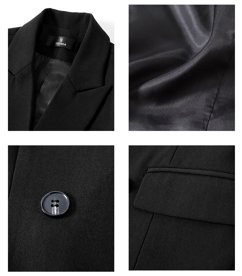 シンプルでエレガントなスーツセットアップです。フォーマルからカジュアルまで幅広いシーンで活躍します。ボトムスは、膝上丈のスカート、クロップド丈のパンツ、フルレングスのパンツからお選びいただけます。
