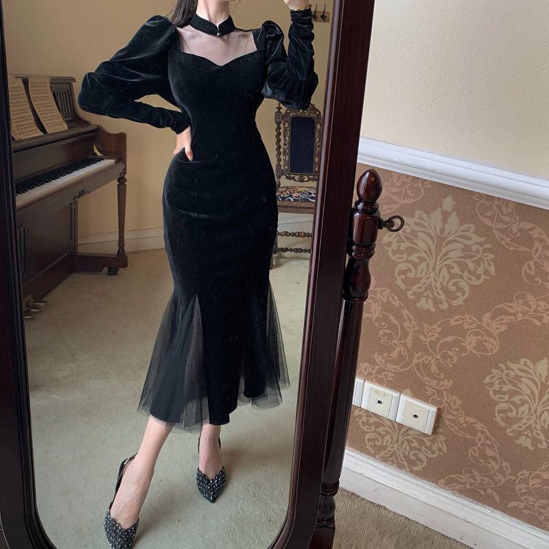 レディース ワンピース ドレス ミモレ 長袖 パワーショルダー ペザントスリーブ イリュージョンネック ペンタゴンネック チョーカーネック タイト スリム 細身 マーメイド フェミニン ボディコンシャス アワーグラスライン チュール シースルー ベロア シアー ベルベット 大人可愛い シンプル 上品 エレガント 抜け感 ゴシック ラグジュアリー セクシー 色気 シック 無地 秋 冬 結婚式 二次会 披露宴 演奏会 同窓会 パーティー コンサート スタイルアップ S M L XL 2XL 黒 ブラック