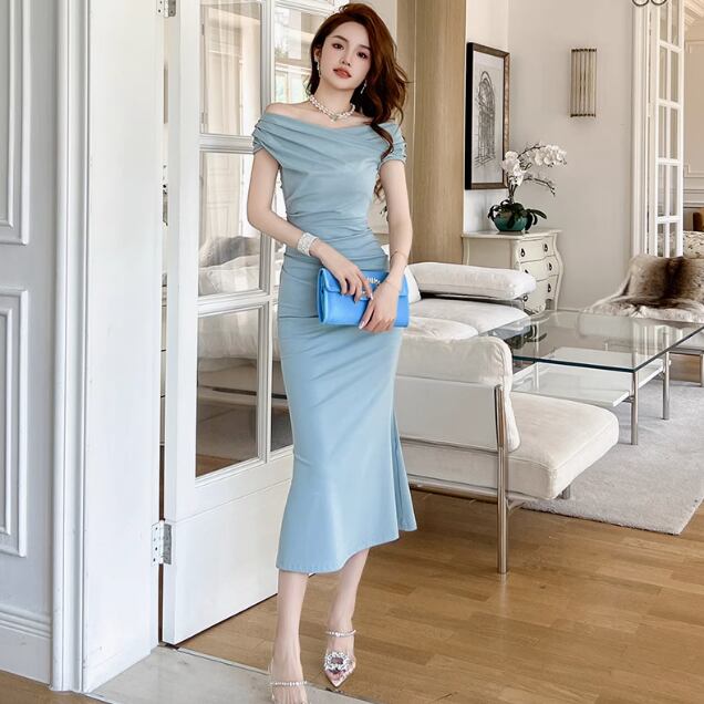 レディース スカート ワンピース ドレス ロングスカート ミモレ ロング オフショルダー 襟なし セミフレア タイト スリム 細身 ファスナー ハイウエスト かわいい 大人可愛い きれいめ シンプル 上品 おしゃれ かっこいい こなれ感 主役級 存在感 キュート ナチュラル セクシー 色気 無地 春 夏 ビジネス デート お出かけ パーティー イベント リゾート レストラン 休日 発表会 美脚 脚長 モテ 清楚 スタイルアップ 肌見せ S M L 黒 ブラック ライトブルー ベーシックカラー 大人カラー