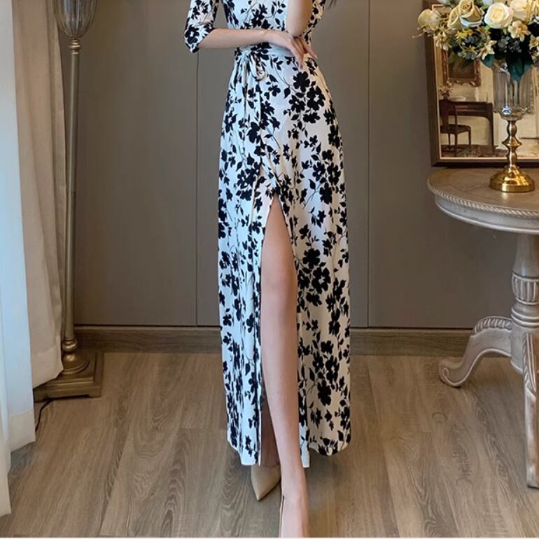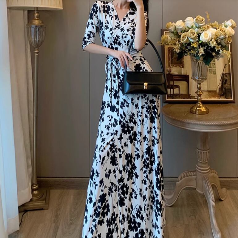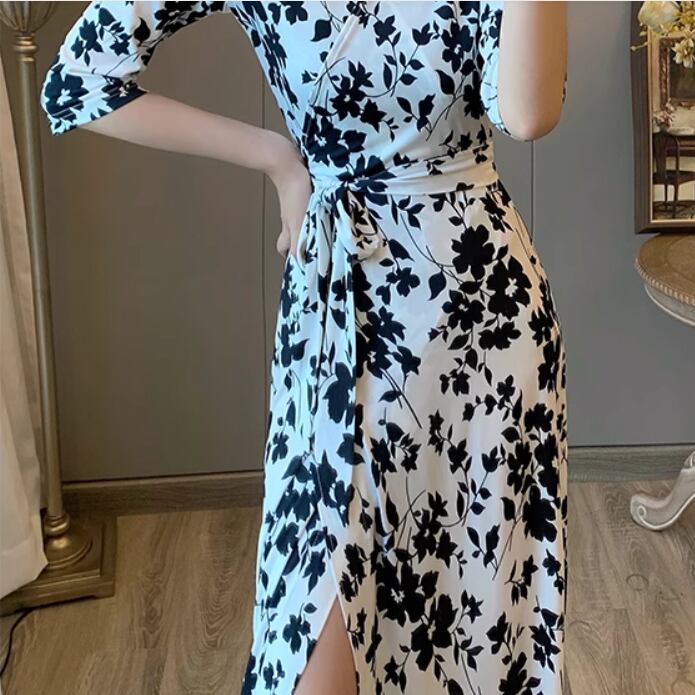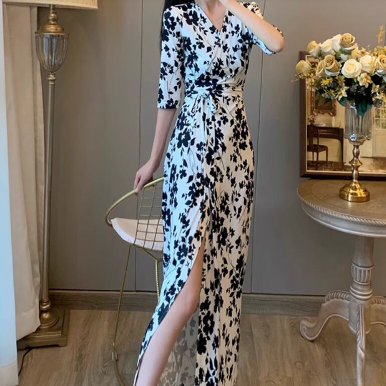 レディース スカート ワンピース ロングスカート 5分袖 7分袖 Vネック スリム Aライン ベルト ウエストマーク ウエストリボン スリット ハイウエスト かわいい 大人可愛い きれいめ シンプル カジュアル 上品 おしゃれ こなれ感 エレガント キュート ナチュラル セクシー 色気 花柄 フラワー 総柄 春 夏 デート お出かけ お泊まり パーティー イベント リゾート 旅行 海 休日 バカンス コーデ 楽ちん 美脚 脚長 普段使い モテ スタイルアップ 肌見せ S M L XL 白 黒 大人カラー