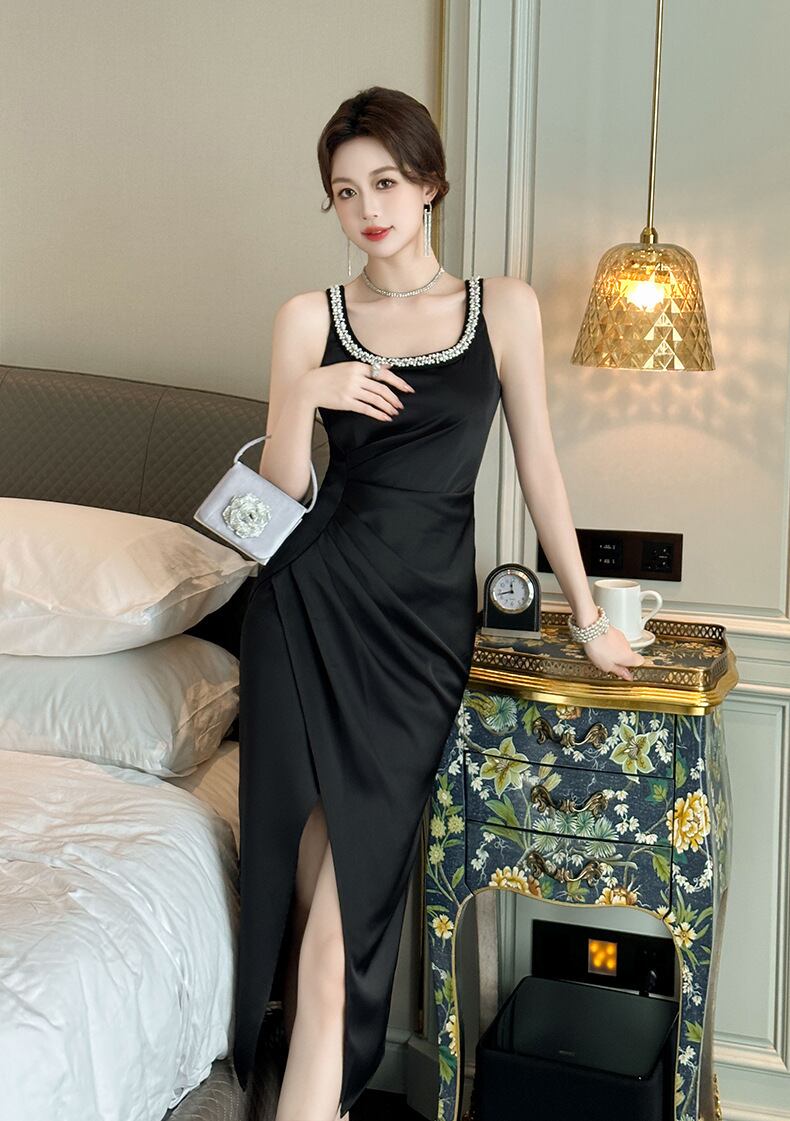 レディース ワンピース ドレス ミディアム 膝下 ミモレ 袖なし ノースリーブ Uネック 襟なし タイト スリム 細身 ドレープ フェミニン スリット ファスナー 大人可愛い きれいめ シンプル 上品 おしゃれ クール エレガント 存在感 抜け感 セクシー 色気 華やか 無地 春 夏 デート お出かけ パーティー イベント リゾート ホテル モノトーン クラブ キャバ ラウンジ 演劇 舞台 美脚 脚長 モテ インスタ映え 肌見せ S M L 黒 ブラック 大人カラー