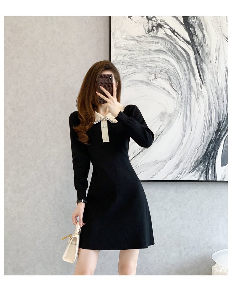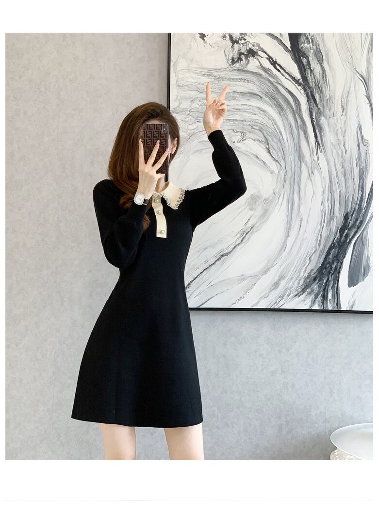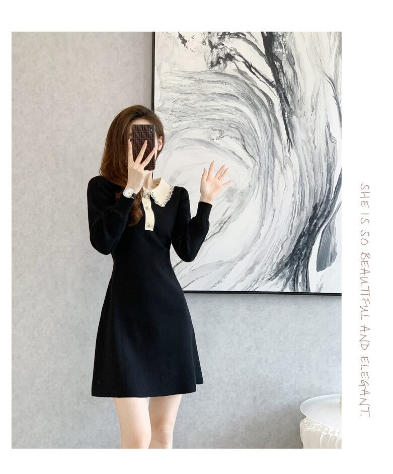 レディース ワンピース ニットワンピ セータードレス ミニ 長袖 襟付き 角襟 セミフレア Aライン フェミニン レース 飾りボタン ビジュー リブニット ストレッチ 伸縮性 パール かわいい 大人可愛い きれいめ シンプル カジュアル 上品 おしゃれ ガーリー エレガント 抜け感 キュート 都会的 ロマンティック シック ノーブル 華やか 無地 春 秋 デート お出かけ 普段使い モテ 清楚 定番 S M L XL 黒 ブラック