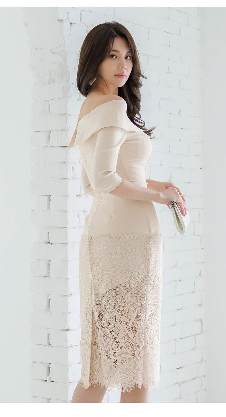 エレガントでフェミニンなドレスのご紹介です!このシースドレスは、膝丈で美しいアワーグラスラインを描き、7分袖とオフショルダーデザインが魅力的です。裾にはシースルーの花柄レースがあしらわれており、特別な日やお出かけ、パーティーシーンにぴったりの一着となっています!