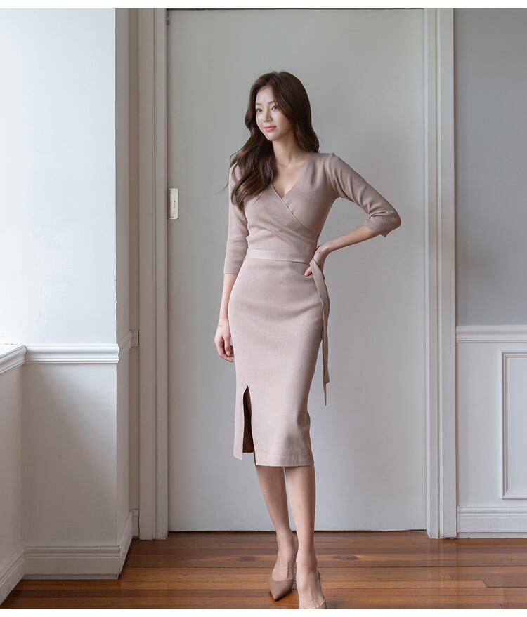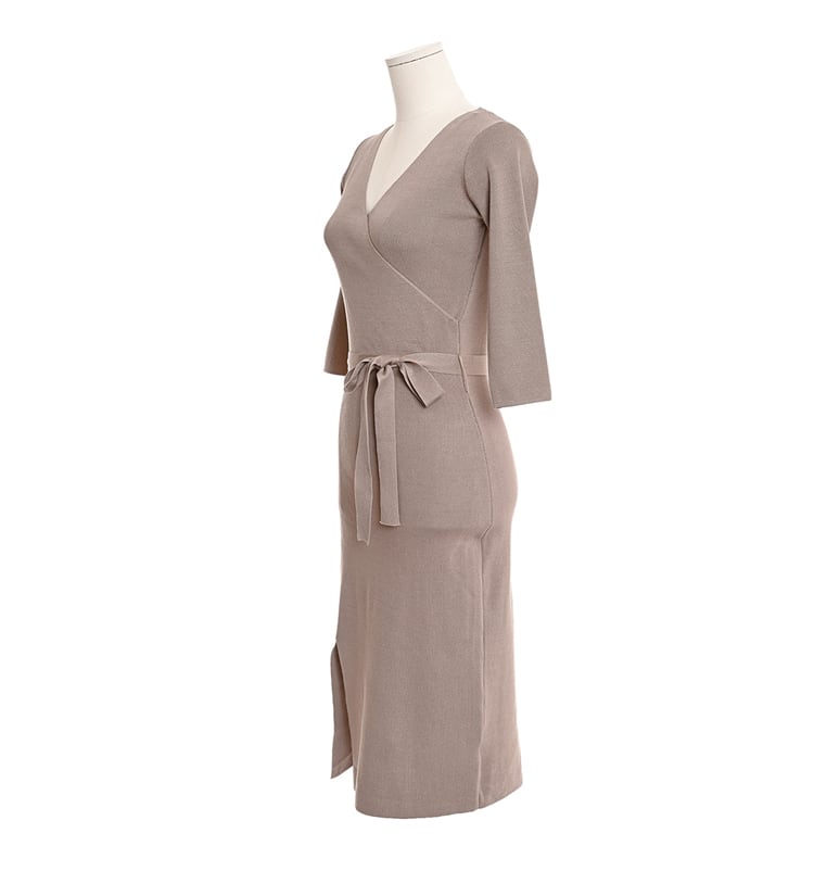 レディース ワンピース サマーニット ニットワンピ シースドレス セータードレス 膝丈 ミディ 7分袖 Vネック タイト スリム 細身 スマート フェミニン ボディコンシャス スレンダー アワーグラスライン ウエストマーク サイドスリット ハイウエスト リブニット ストレッチ 伸縮性 大人可愛い きれいめ シンプル カジュアル 上品 おしゃれ こなれ感 エレガント 抜け感 都会的 ベーシック セクシー シック 無地 春 秋 デート お出かけ 普段使い スタイルアップ フリーサイズ ブラック ライトブラウン