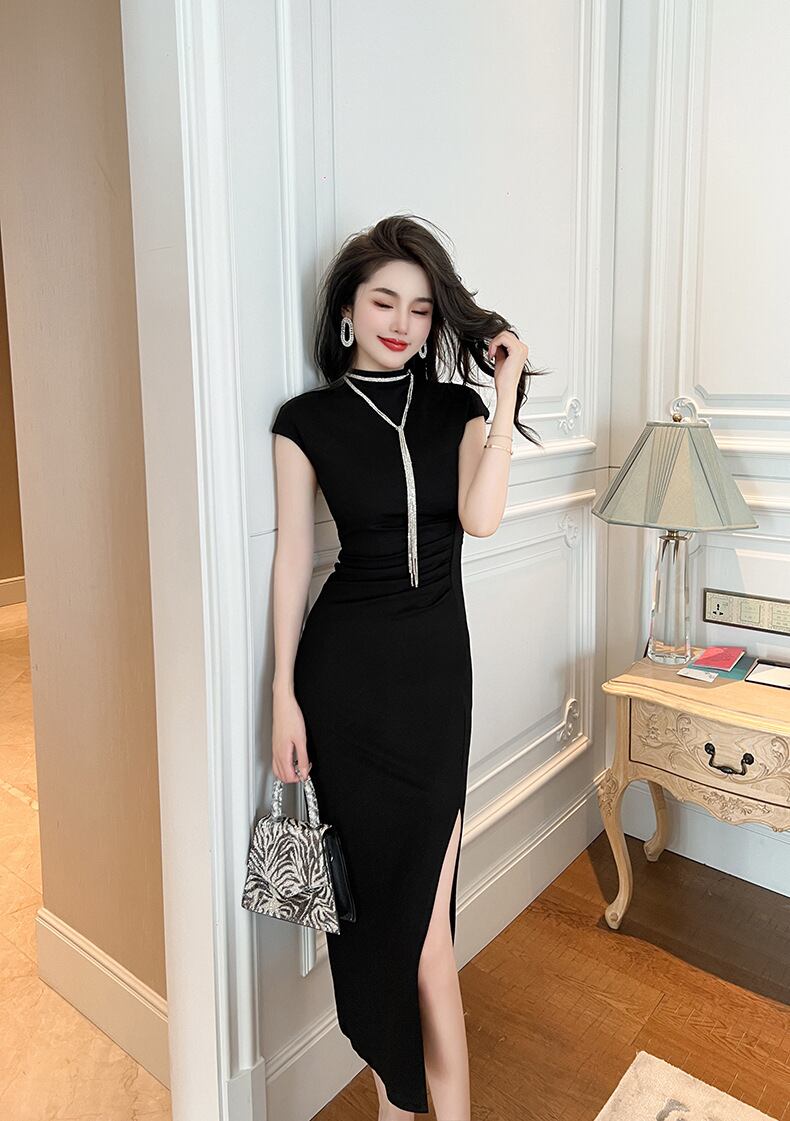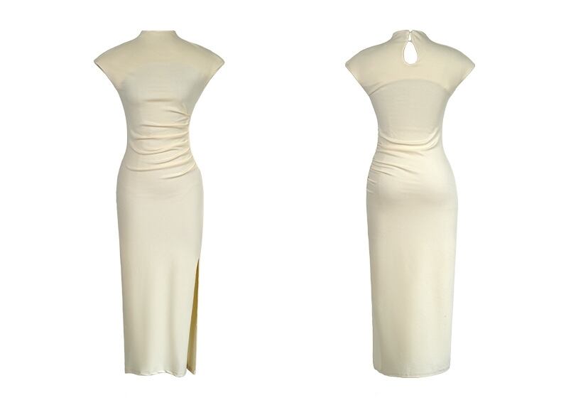 レディース ワンピース ドレス シースドレス ミモレ ロング 半袖 フレンチスリーブ キャップスリーブ ハイネック モックネック スリム 細身 スマート スキニー ボディコンシャス スレンダー アワーグラスライン サイドスリット ギャザー ストレッチ 伸縮性 きれいめ シンプル 上品 おしゃれ こなれ感 クール エレガント モダン 抜け感 かっちり 都会的 セクシー 色気 シック ノーブル 無地 春 夏 お出かけ パーティー 肌見せ S M L XL ブラック アプリコット