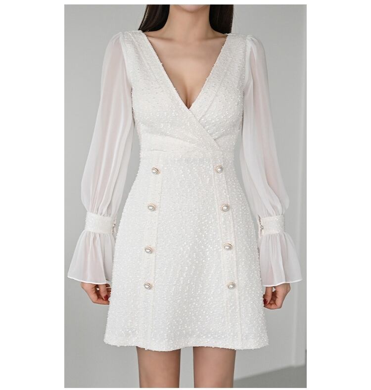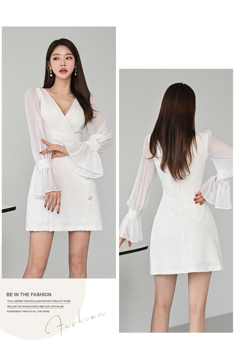 レディース ワンピース ドレス ミニ ショート 長袖 ペザントスリーブ Vネック Aライン フェミニン ファスナー ハイウエスト 透け感 シースルー 飾りボタン シアー かわいい きれいめ シンプル カジュアル 上品 おしゃれ ガーリー 個性的 エレガント モダン 抜け感 キュート 都会的 ラグジュアリー ロマンティック セクシー 色気 シック ノーブル 爽やか 華やか 無地 春 夏 デート お出かけ パーティー 普段使い 肌見せ S M L XL 白 ホワイト
