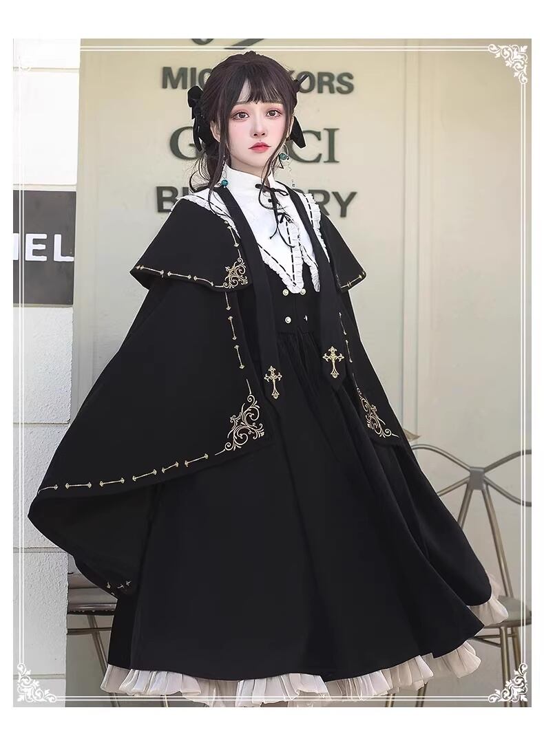 ロリータセット レディース スカート コート 膝丈 膝下 半袖 長袖 襟付き ケープ襟 ワイド Aライン リボン かわいい かっこいい レトロ ガーリー 個性的 ゴシック ロリータ ゴス 無地 秋 冬 発表会 ハロウィン 文化祭 学園祭 学生 学校 お出かけ パーティー イベント 女子会 休日 コンサート ライブ コスプレ モノトーン 演劇 舞台 お揃い 双子 コーデ 暖かい 防寒 プレゼント 体型カバー インスタ映え 定番 コスチューム 衣装 S M L XL 2XL 3XL 黒 ブラック ゴールド