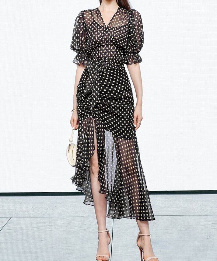 レディース スカート ワンピース ドレス フレアスカート ロングスカート 膝下 ロング アンクル丈 半袖 5分袖 ボリューム袖 Vネック アシンメトリーネック フレア セミフレア ウエストマーク スリット サイドスリット ハイウエスト 透け感 薄手 かわいい 大人可愛い きれいめ シンプル カジュアル 上品 おしゃれ かっこいい こなれ感 エレガント セクシー 色気 ドット柄 総柄 デート パーティー イベント リゾート 旅行 休日 モテ 清楚 スタイルアップ 涼しい S M L XL 黒 ブラック