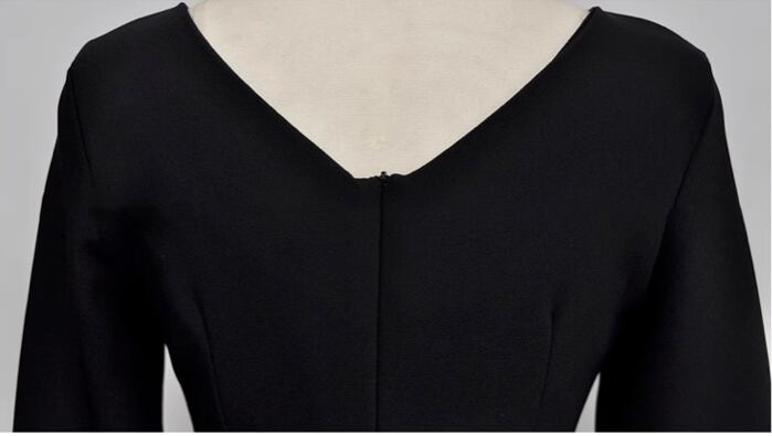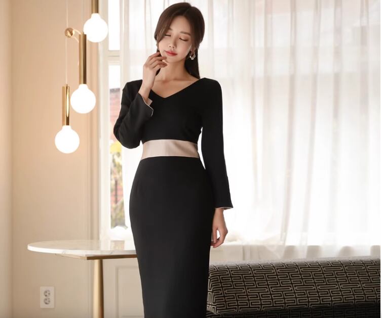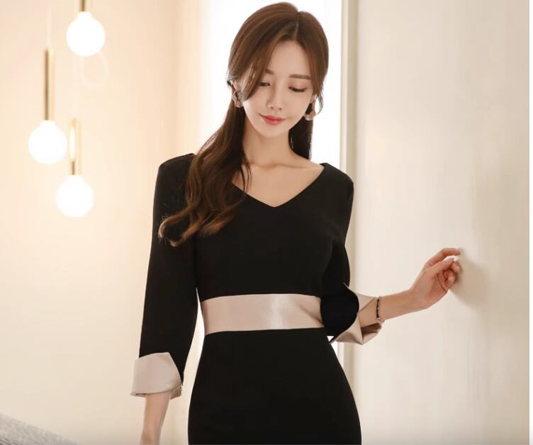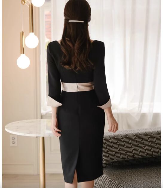 レディース ワンピース ドレス 膝下 7分袖 長袖 折り返し袖 Vネック 襟なし タイト スリム 細身 Xライン ウエストマーク バックスリット ハイウエスト コンサバ バイカラー 配色 きれいめ シンプル 上品 おしゃれ かっこいい クール エレガント 都会的 セクシー 無地 春 夏 秋 会議 MTG ミーティング 演奏会 同窓会 ママ オフィス OL 通勤 デート イベント レストラン 女子会 ホテル コンサート 合コン 婚活 美脚 脚長 トレンド スタイルアップ S M L XL 黒 ブラック