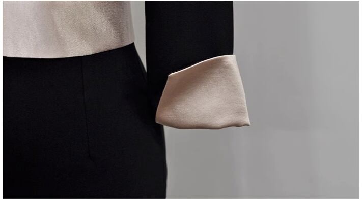 折り返し袖がゴールドで上品さを引き立て、バックスリットや切り替えデザインがスタイリッシュな存在感をもたらします。