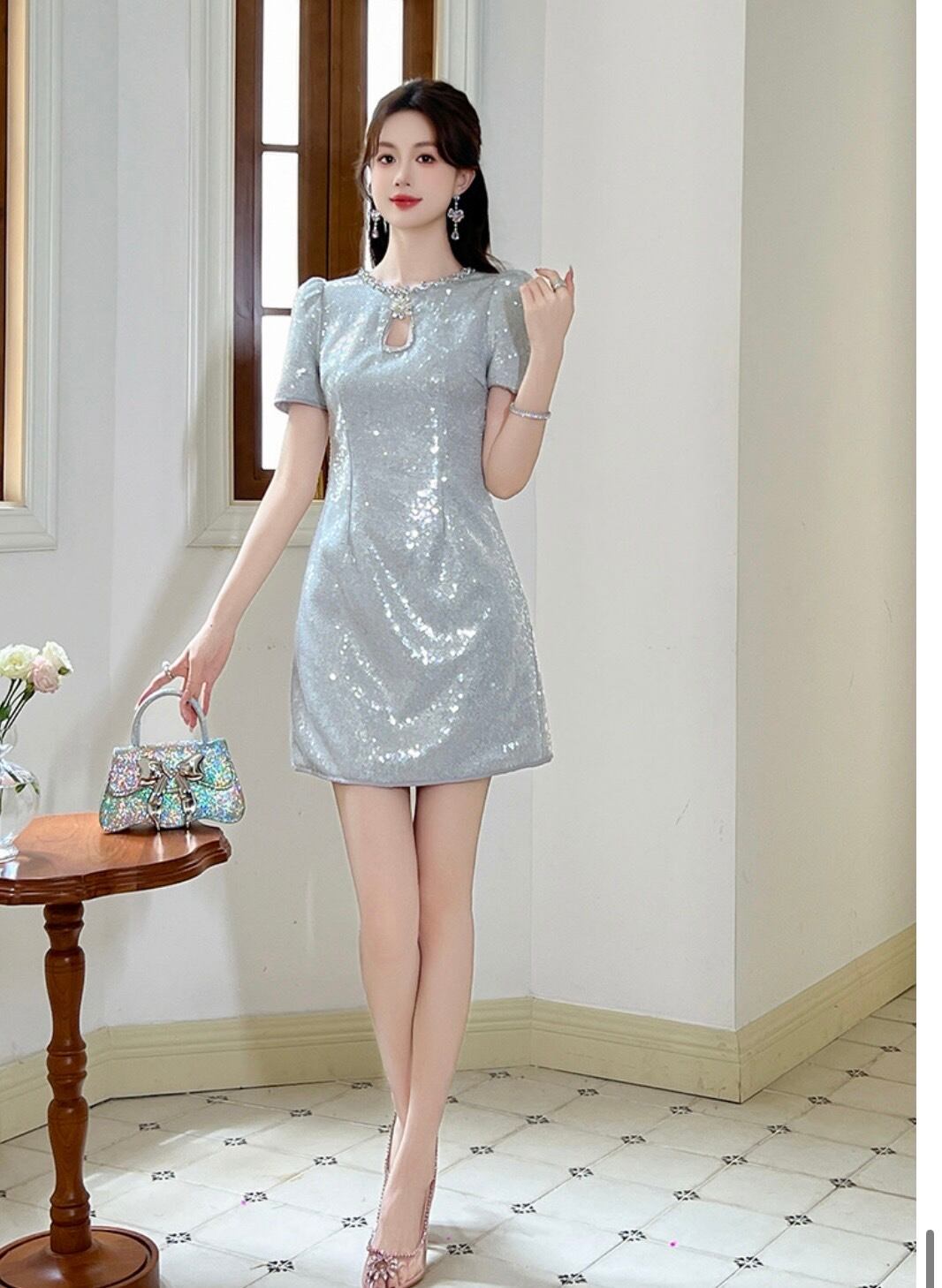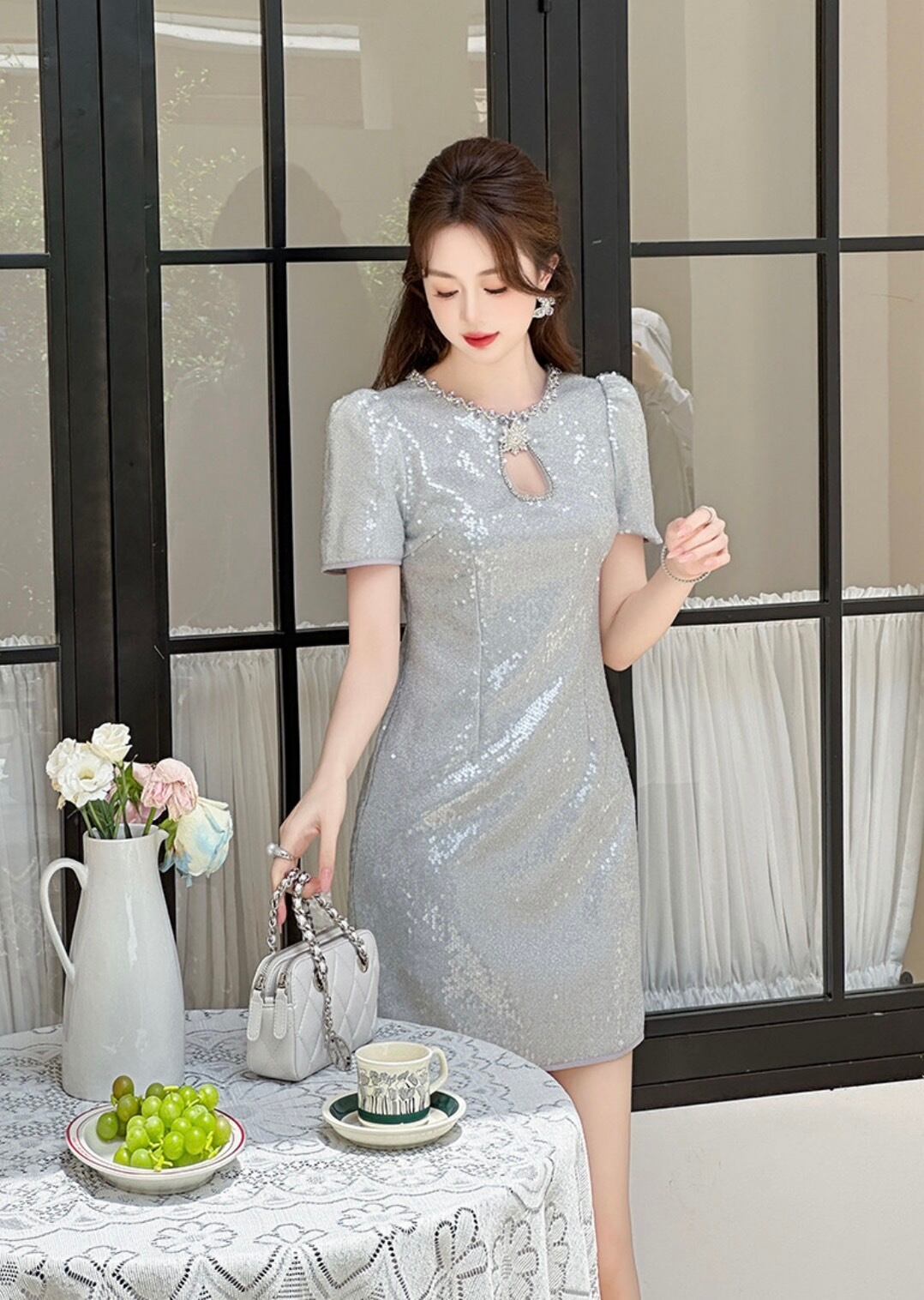 エレガントでありながら、華やかな魅力が際立つドレスをご紹介いたします!ミニ丈がキュートさを引き立て、膝上のデザインがセクシーさを演出。半袖のパフスリーブが女性らしいシルエットを作り出します。上品なライトグレーの色味が、春夏の様々なお出かけやパーティーシーンにぴったり。スパンコールや飾りボタンのキラキラとしたディテールが、シンプルな中にも華やかさを添え、大人の女性にふさわしい洗練されたスタイルを楽しむことができます。
