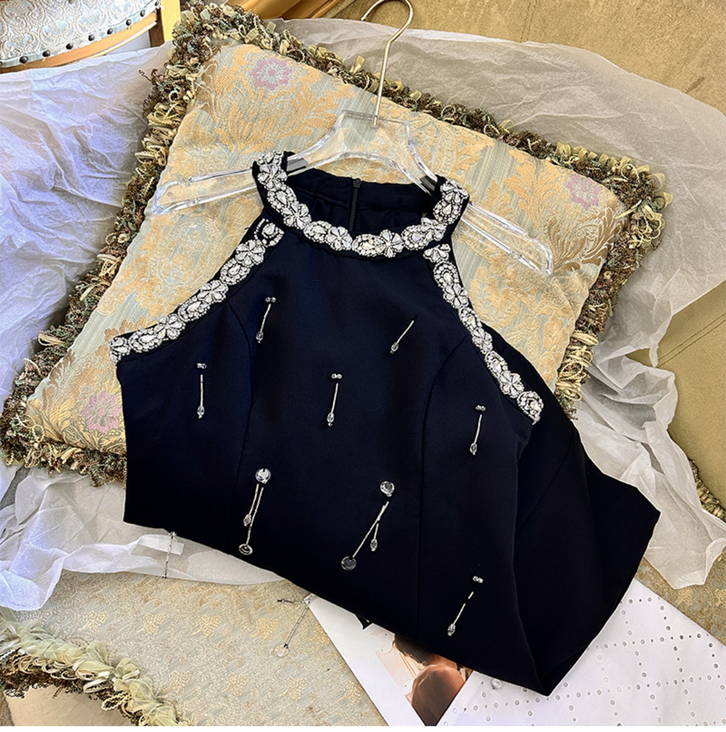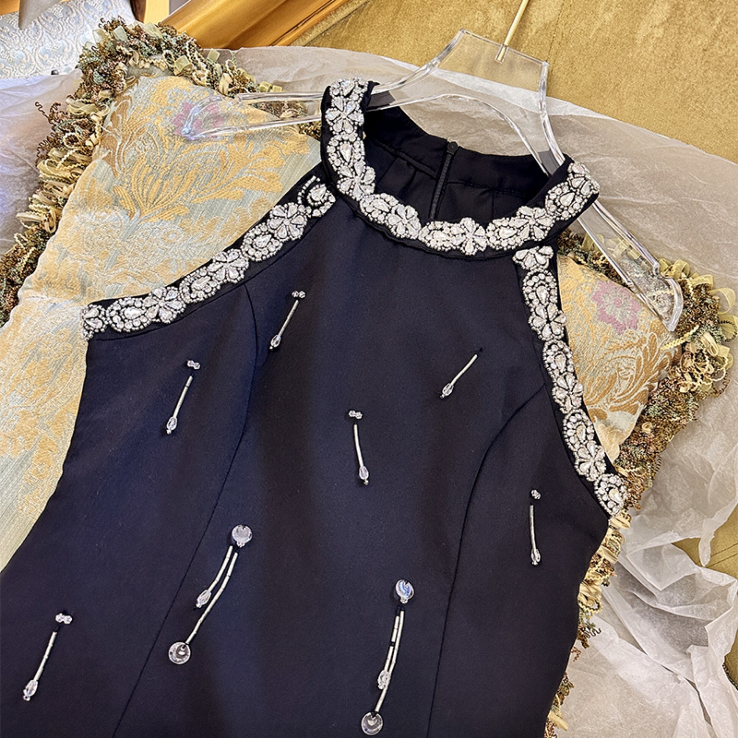 レディース ワンピース ミニ 膝上 袖なし ノースリーブ アメリカンスリーブ ホルターネック アメリカンアームホール セミフレア Aライン ハイウエスト 異国風 薄手 ビジュー ビーズ かわいい 大人可愛い きれいめ カジュアル 上品 おしゃれ エキゾチック 個性的 エレガント モダン 抜け感 キュート 都会的 ラグジュアリー アメリカン シック ノーブル 華やか ゴージャス 春 夏 デート お出かけ パーティー クラブ 普段使い 涼しい S M L 黒 ブラック