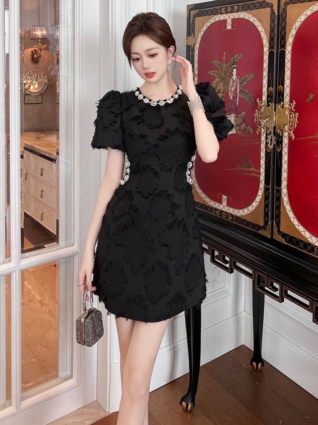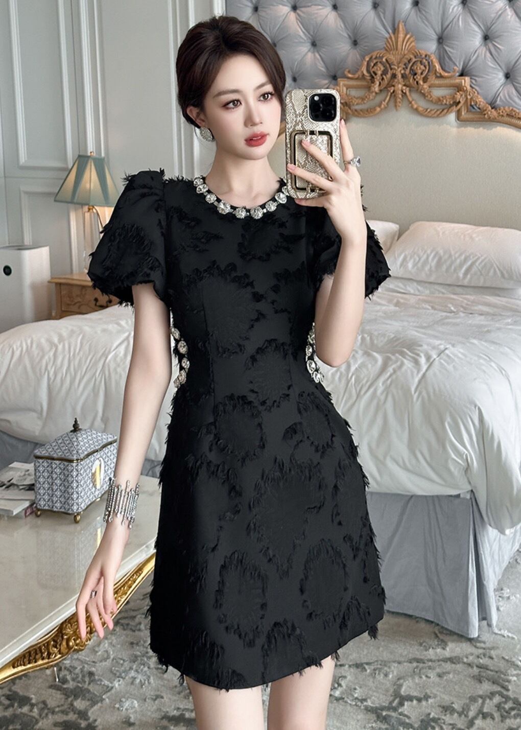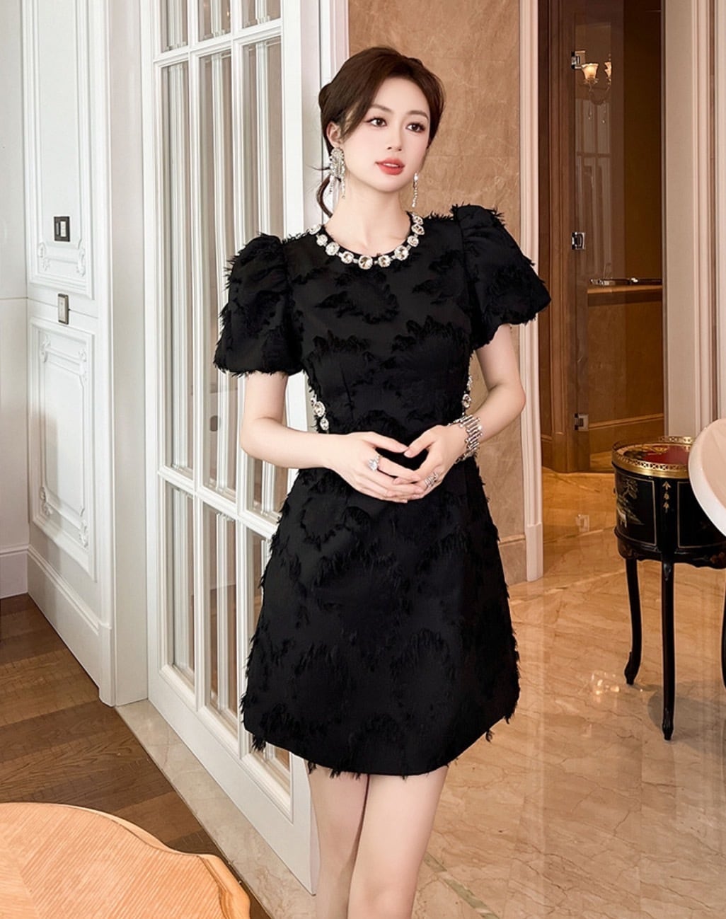 膝上のミニ丈で、ボリュームのあるランタンスリーブが可愛らしさを引き立てます。ネックレスのようにビジューをあしらったクルーネックデザインが上品です。ふわふわとしたドット風の地模様と煌めくビジューラインストーンが、特別な日のコーディネートに華やかさを添えます。