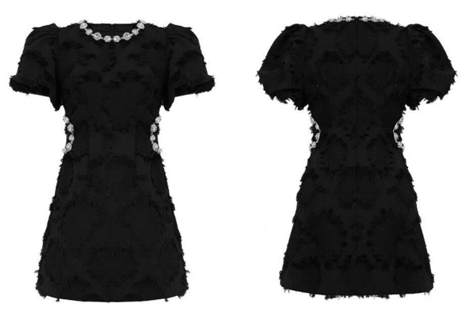 サイドビジュー レディース ワンピース ドレス ミニ 膝上 半袖 ボリューム袖 パフスリーブ ランタンスリーブ クルーネック 襟なし Aライン フェミニン ハイウエスト ふわふわ ビジュー ラインストーン かわいい 大人可愛い きれいめ シンプル 上品 おしゃれ エレガント キュート 都会的 ラグジュアリー 華やか 可愛い 総柄 ドット風 春 夏 誕生日 お呼ばれ デート レストラン ホテル 韓国 オルチャン コーデ 脚長 モテ 清楚 インスタ映え スタイルアップ S M L 黒 ブラック モノトーン