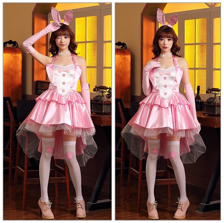 うさ耳カチューシャとグローブが付属する、バニーガールスタイルのドレスです。ストレッチ素材を使用しており、伸縮性に優れているため、心地よくフィットします。ホルターネックやベアバックデザインがセクシーでありながらも、フレアシルエットが可愛らしさを引き立てます。さらに、フィッシュテールやティアード、フラウンスが華やかな印象を与え、パーティーや文化祭などのコスプレにぴったりな一枚です!