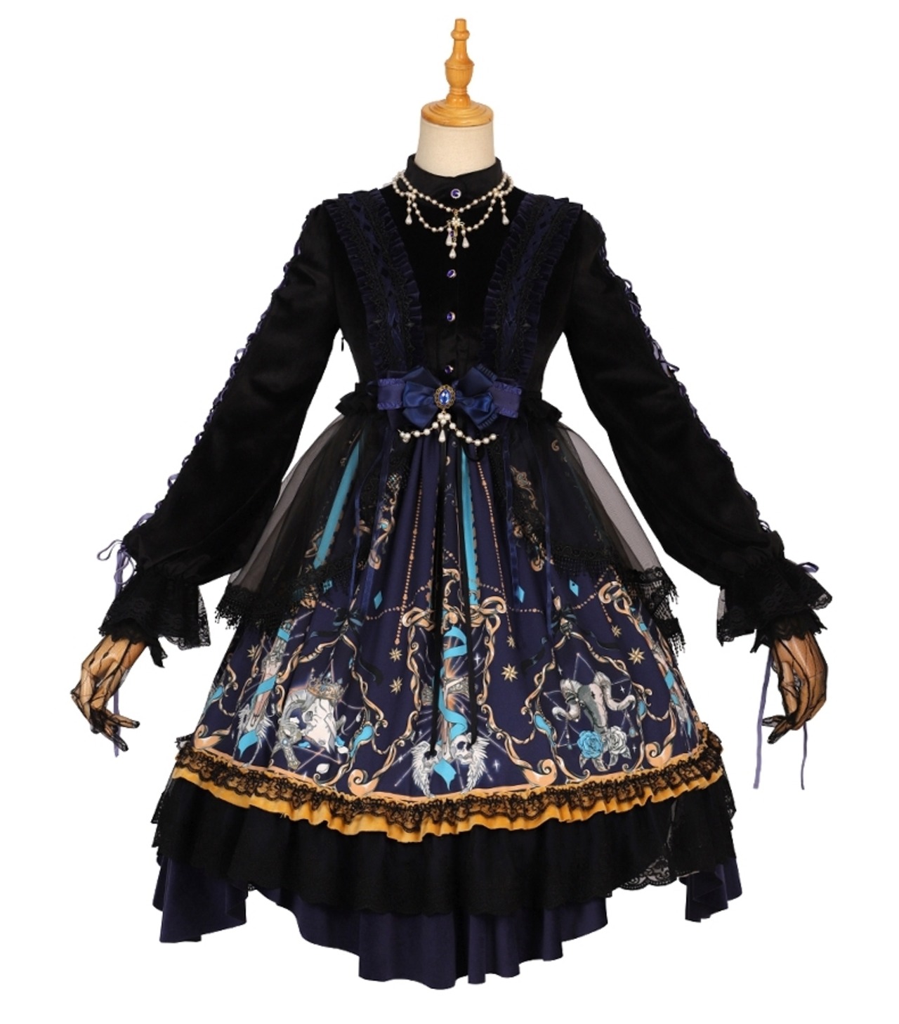 優雅で華やかなゴスロリスタイル! ドレス、オーバースカート、ネックレス、グローブ、ボンネット、ケープの6点セットで、本格的な異国風のエレガントな装いを演出。ペザントスリーブとハイネックがクラシカルな印象を際立たせ、Aラインシルエットが美しく広がります。ベロアやサテンの高級感あふれる素材に、ビジューやパールが煌めくロマンティックなデザイン。秋冬のコスチュームや仮装イベントで主役級の華やかさを放つ一着です。